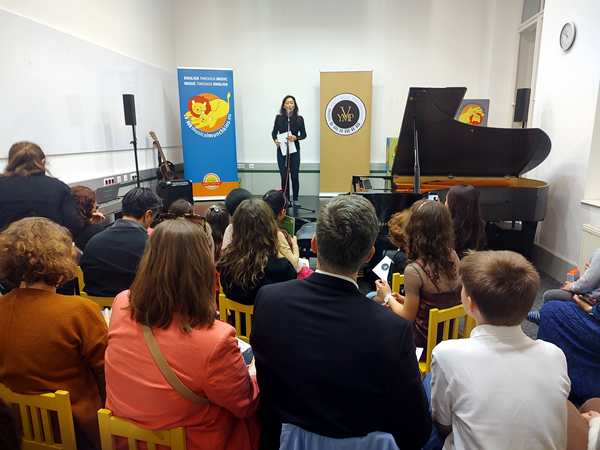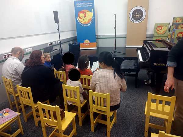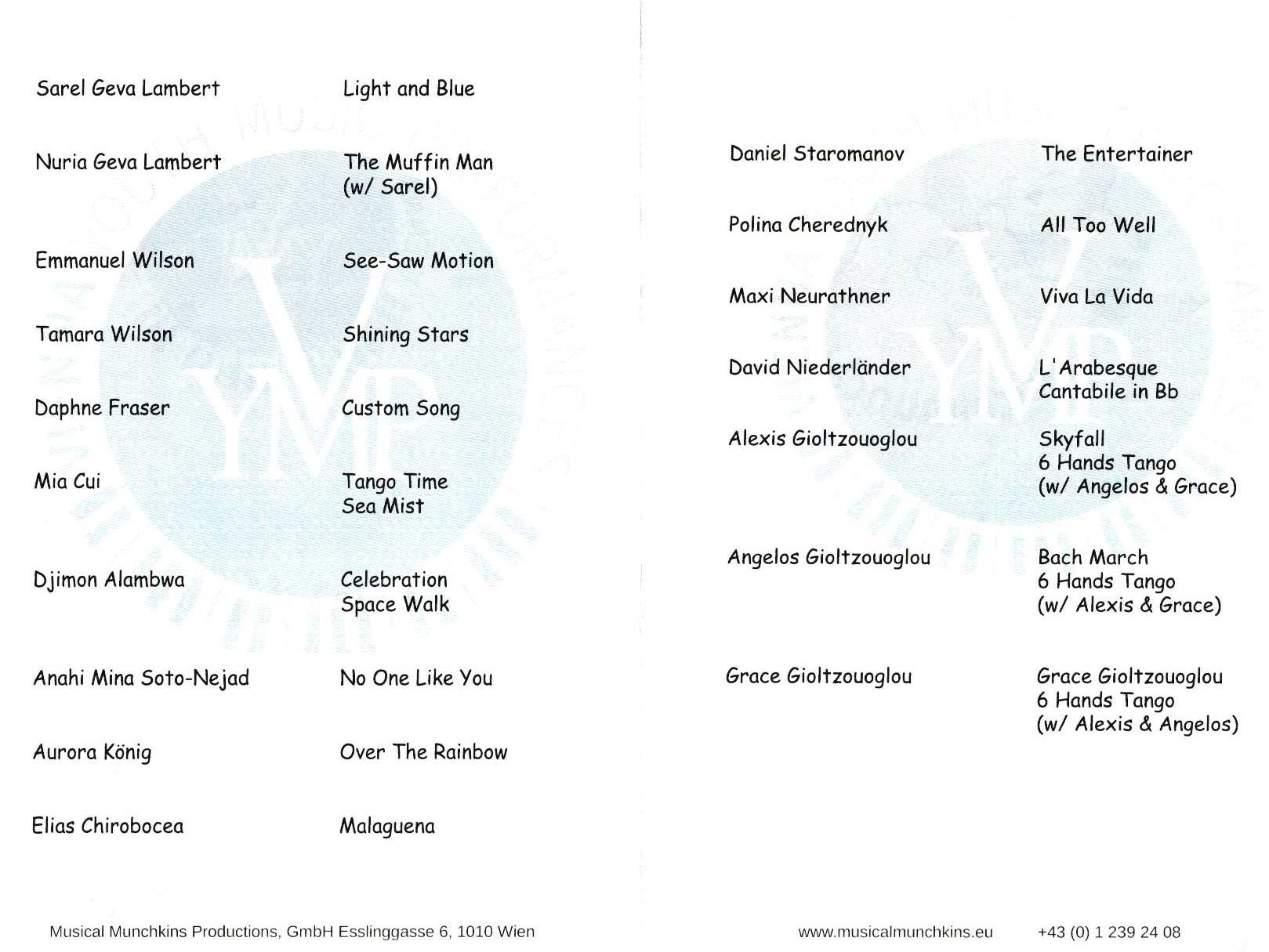 The time for their talent show had finally arrived. It was their first time taking part. We got there early, about 15 minutes before it started at 7 pm, so there weren't too many people yet. They had already set out some food and drinks and set up chairs in the biggest room where the Bösendorfer grand piano is located. I chose a seat in the back row so I'd be able to get up and film without bothering anyone. Tammy and Emmy headed to the first row and sat down there. There was another girl on their level that is part of the Thursday class, but they know her, so they talked with her and had fun with her. The room was filling up more and more until it was completely full. I got myself a program and a drink. I saw that Emmy was third and Tammy fourth on the list.
