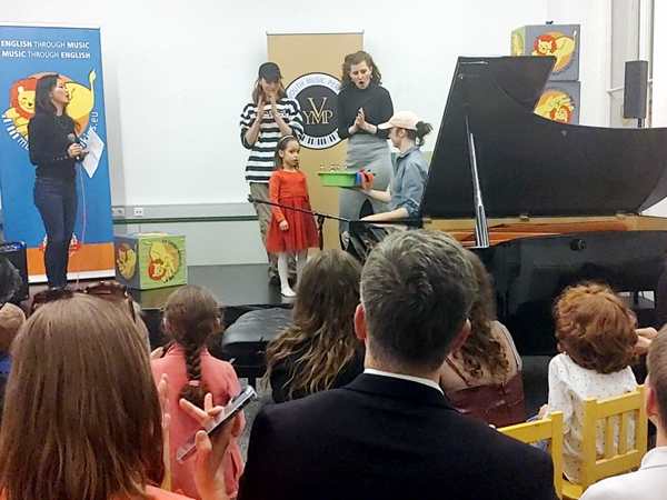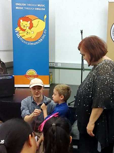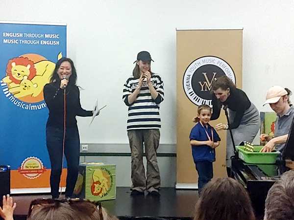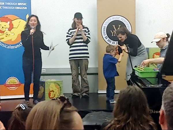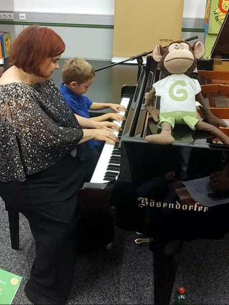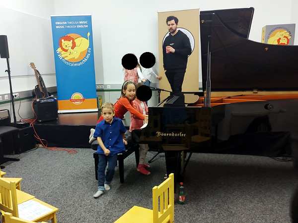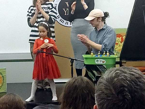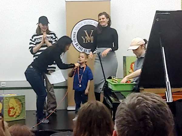 The founder and director of the school opened the evening with a short talk. Soon it was Emmy's turn, as he was third. Originally he was going to play by himself, but then he wanted me to play it with him, and I thought that would be quite original and unique, maybe improving his chances of a good result. We went to the front, where the teacher leading through the program held the microphone to his mouth, asking him to say his name and what he was playing. When he said he was playing "See-Saw Motion" with his Mom, an "ah" went through the whole room. I put the mascot on the piano, then we sat down on the stool.