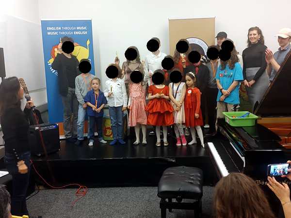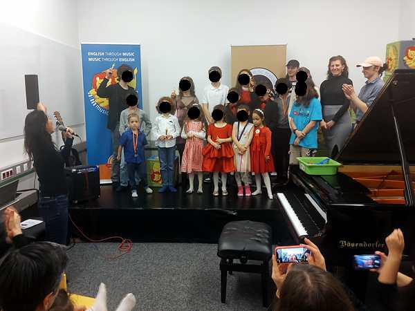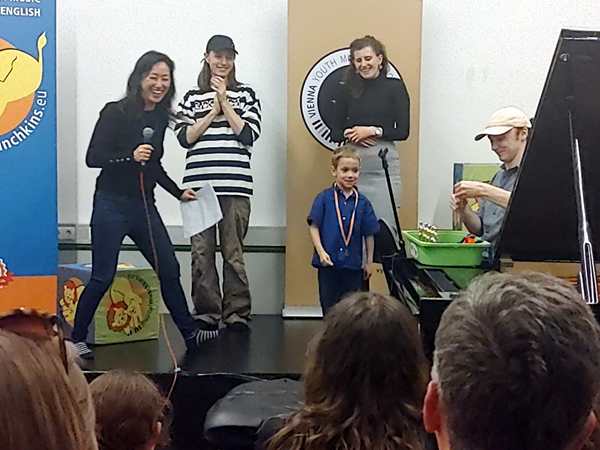 Many more kids played and sang. Tammy and Emmy came to me and left again a few times. Once everyone had performed, the director and the teachers left to deliberate. Thy were going to rate all the 18 performers and put them in an order from first to last. The rest of us got to eat some food and have some drinks and wait. The kids ate some, then had fun on the stage and playing the big piano together with other kids. It took a while, but then the teachers returned.