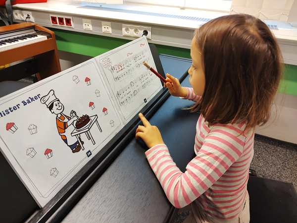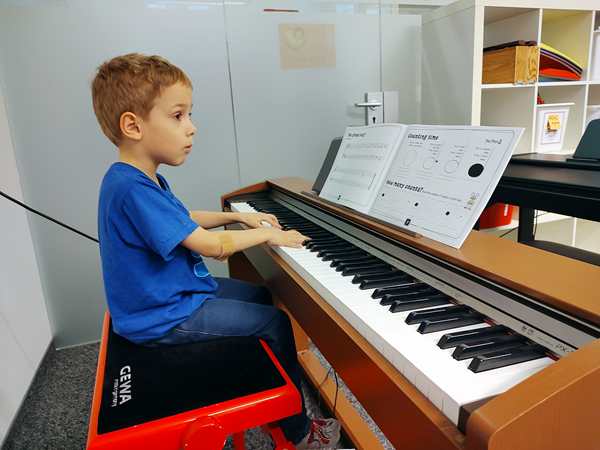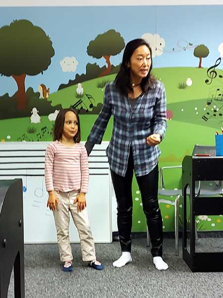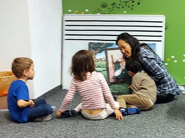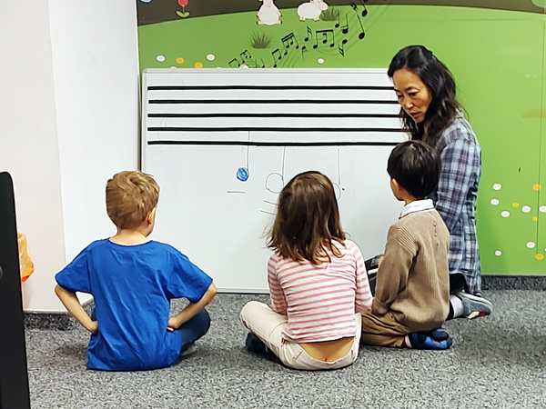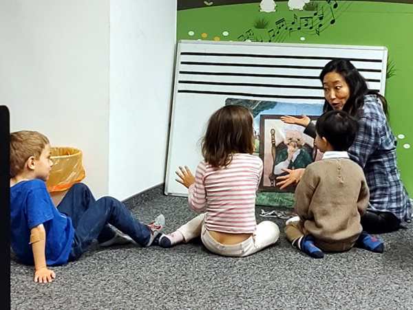 The class started with the greeting song, then Tammy was calling for a guessing game. Today the teacher made them guess all that we were going to do at the Easter Party next week. Then they did the fingers touching the thumb warm-up, then the finger exercises on the piano.