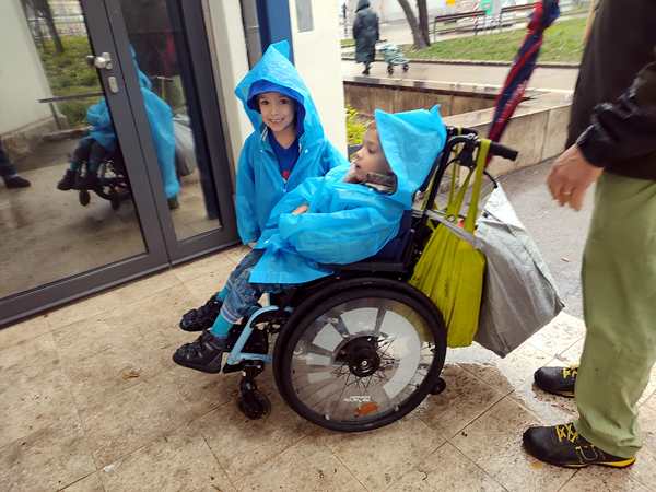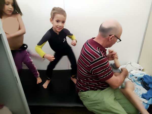 I ordered, and we sat down and had a good time eating and having fun. They got some new dinosaurs in their Happy Meals. They also had a special deal for icecream which was their dessert. Then we put their raincoats back on and crossed the square to the swimming pool. We paid, then walked around the building to the wheelchair-access entrance. They let us in, and we went to the changing room to get changed. Emmy started dancing in his swimsuit, then Tammy joined in. It was too funny, and I filmed them.