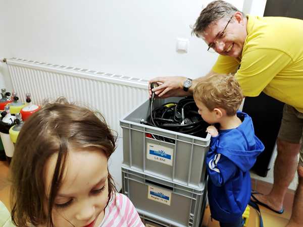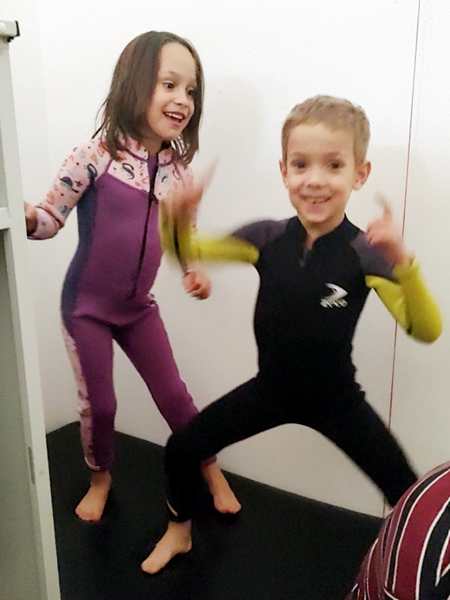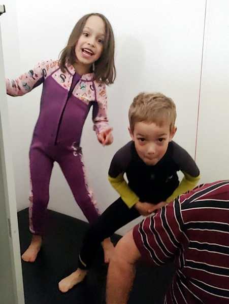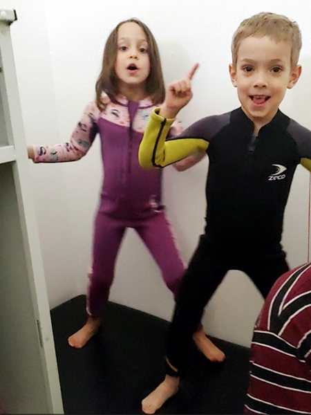 We got dressed again, and the kids went to the hairdryer. We were waiting in the area for Daddy to be done. A teacher was preparing his diving equipment for his class, and he was really nice and explained stuff to Emmy. I asked him, and he said diving classes started at the age of 8. Then he gave all three kids a lollipop.
