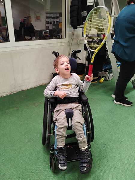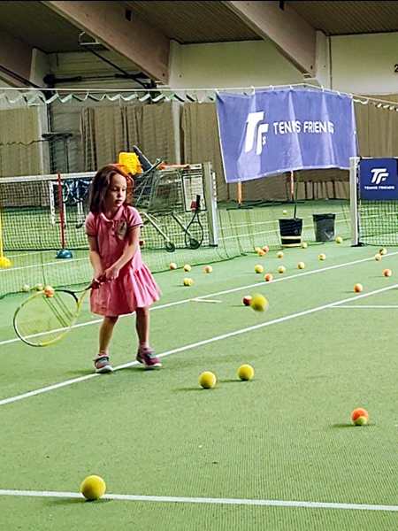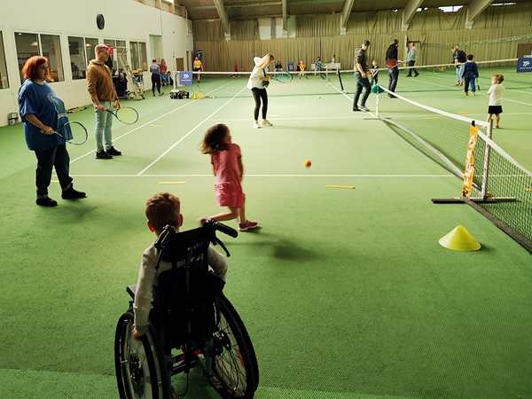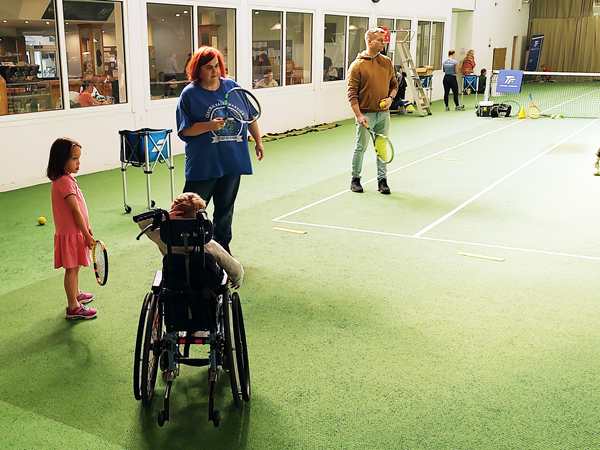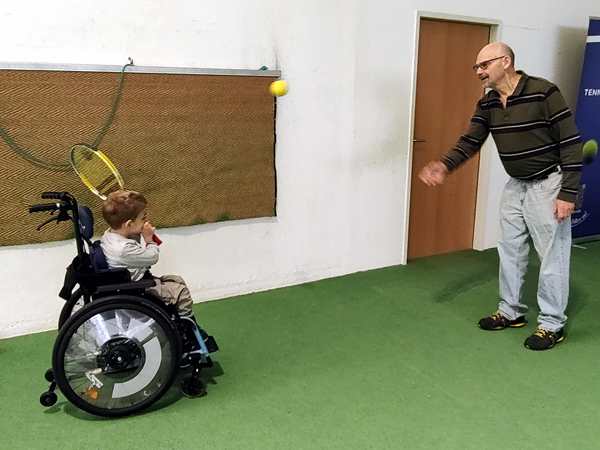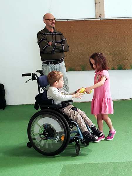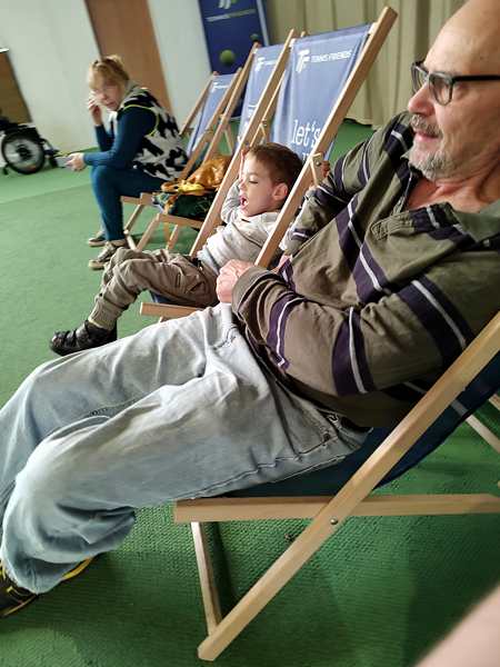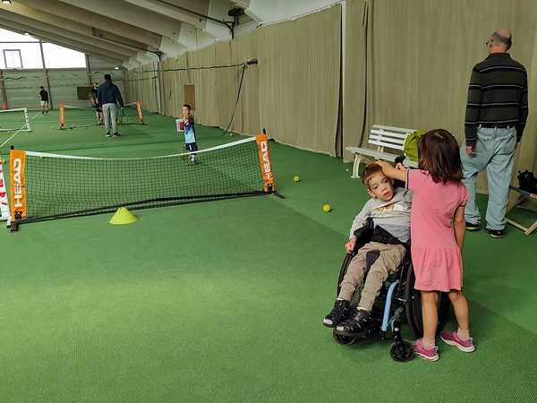 We took the subway, then an old train to go to the north of Vienna. It was a challenge getting three scooters and the wheelchair plus kids in. Once we got off, Tammy, Emmy and I went ahead on our scooters, covering the long distance to the tennis hall, as it was late already. Once there, they took their long pants off, then we waited for Daddy who had their shoes. In the meantime they got their name tags with a number. Emmy was 9, and Tammy 10. After having put their shoes on, they went on the court, where lots of children were already playing with their parents. I then started playing with Emmy as well.