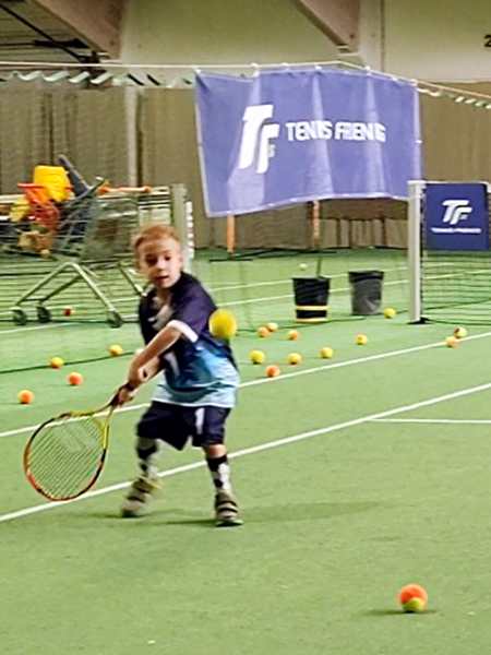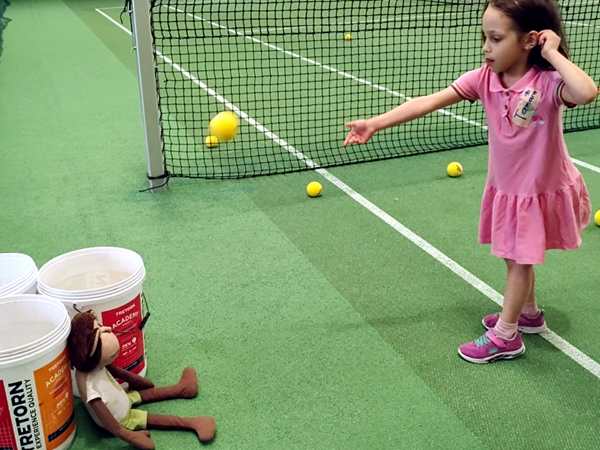 At the first court where they were, three kids had to try to make cones fall over by hitting balls on the floor, while the fourth kid was playing tennis with the teacher. The teacher was counting how many times they could play back and forth. Emmy was doing very well, hitting every ball and having better posture than his sister.