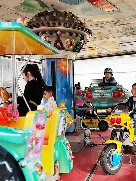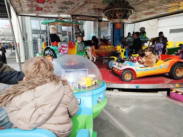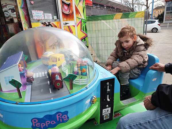 We all put our clothes back on and left. This time we went to the tram, as it was a long time until the next train. After getting off the tram, we needed to take another one to get home. It was a 10-minute wait time. The kids saw the stands of the Easter market and wanted to look at them, so we went there and walked by them. It wasn't very interesting. But at the end, there was a little train and caroussel. The kids wanted to ride right away. Sammy was not feeling well, but wanted to ride as well. He saw the Peppa Pig ride next to the caroussel, and that's what he wanted to do, and he loved it. Tammy sat in a helicopter, but she was not happy, when she saw that Emmy could move his car high up, which she couldn't. Emmy was greatly enjoying it.