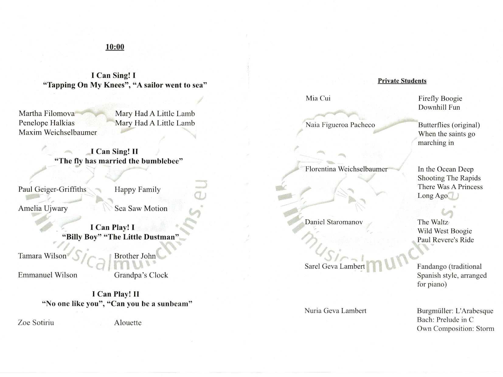 They then all bowed together and came off the stage. Tammy and Emmy sat down with other kids further up front than us. The second part started with the private students sitting down on the stage and coming to the piano one by one to play their songs. They were playing two or three songs each, even their own compositions. It was getting too long for Sammy, and then also Emmy, and lastly Tammy, who left the room one after another and attacked the small buffet already. Once it was all over and the director had said a few more words, I and all the others also left the room.