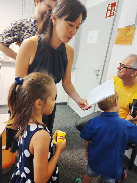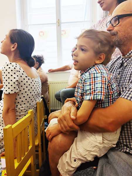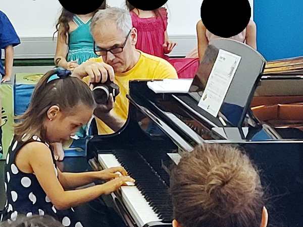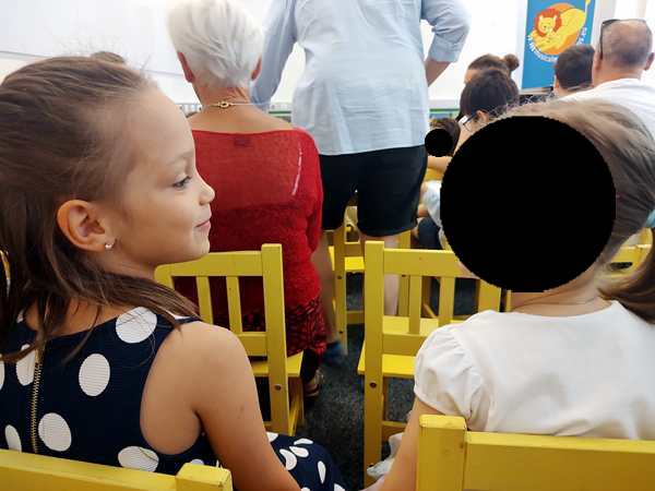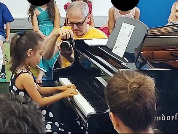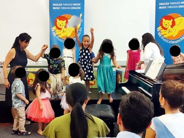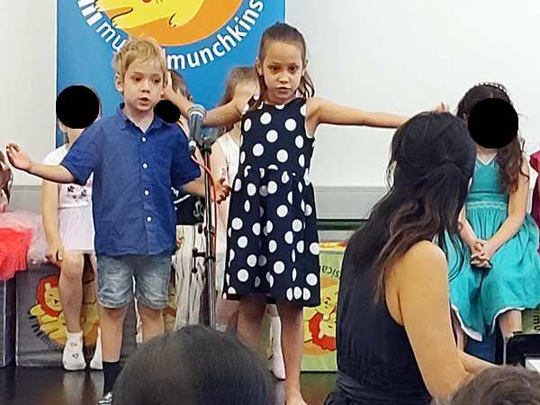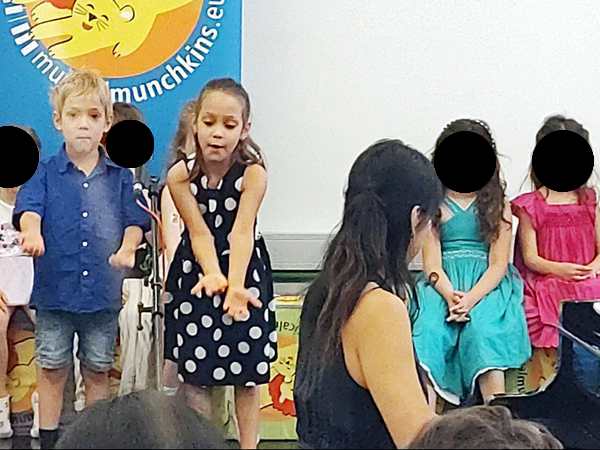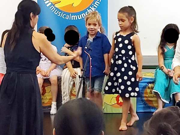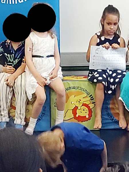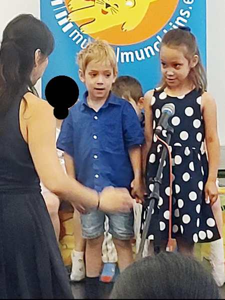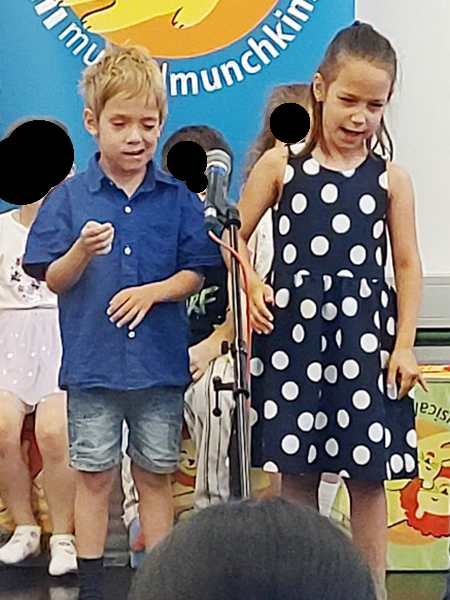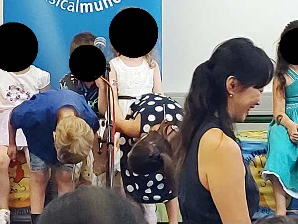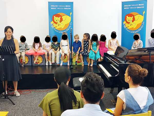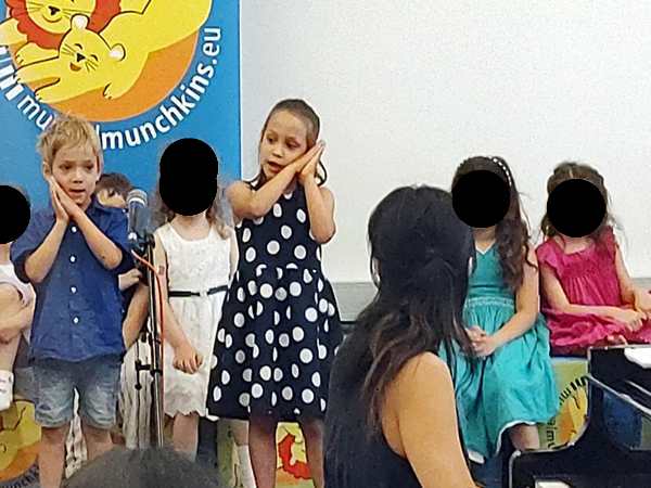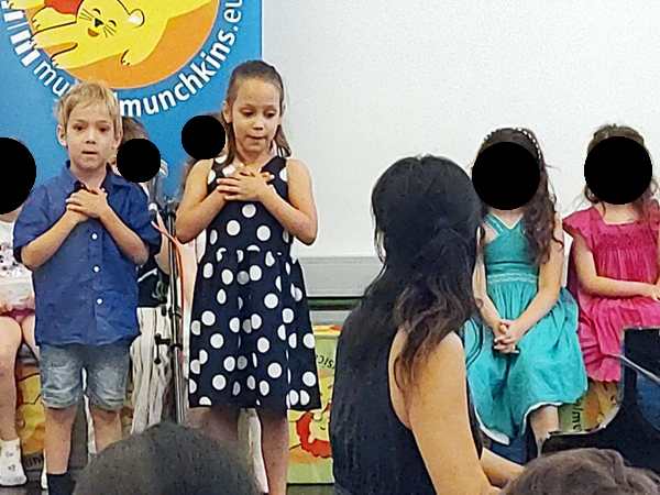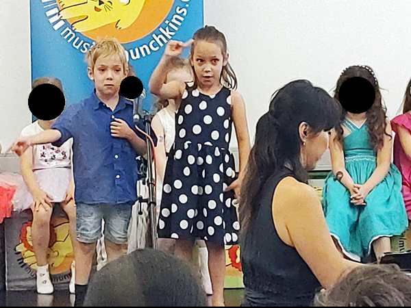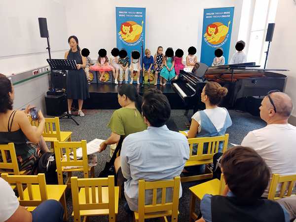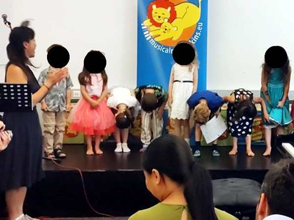 The founder and director of the school, who was also our kids' teacher this semester, then gave a short speech, then it was the kids' turn. All the kids from classes were sitting on the stage, waiting for their turn. They started with the youngest. First, they would sing the songs together that they had learned in class, then they would go to the piano to play what they had prepared to play. There were three groups of kids before Tammy and Emmy, all classes they have already completed. Then it was their turn.