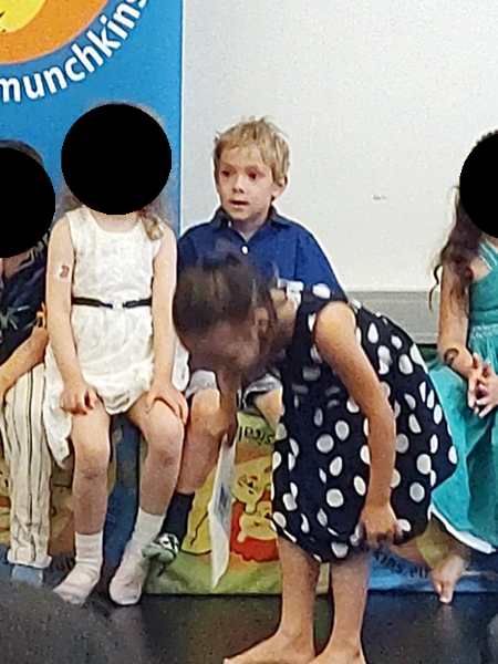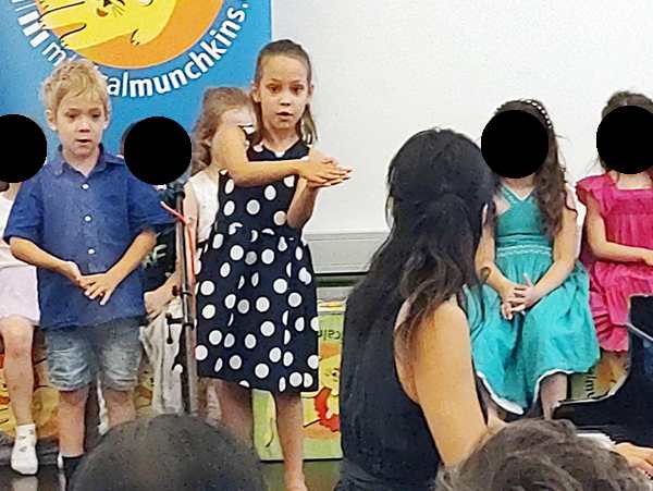 They first sang "Billy Boy" with all the actions, bowed, then sang "The Little Dustman" with actions, then bowed again and sat down. But it was Tammy's turn to come to the piano and play her song. She bowed and sat down, and I made sure she got her sheet music as she wanted it, even though she could play it by heart. Plus, the music is way too high up and far away on the grand piano anyway. In any case, she did look up at it a few times while playing. And she played her song perfectly, no mistakes whatsoever! Yesterday, she had made two mistakes while playing the song in class. I was very proud of her. She bowed and returned to her seat.