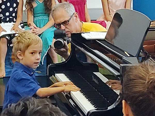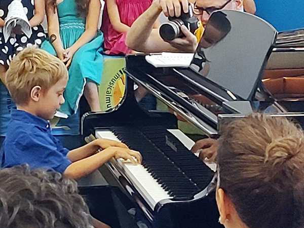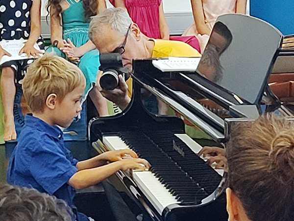 Then it was Emmy's turn. He bowed and sat down at the piano - no sheets necessary. And he also played his song perfectly, making no mistakes at all. Then he bowed and returned to his seat. Sammy was cheering for him really loudly, you can hear it very well on the video. There was one more girl after them who has completed the class they'll be in in fall. It gave us a taste of what's ahead for them next semester.