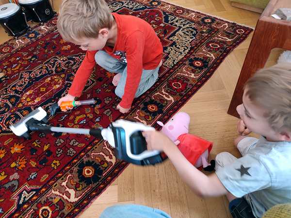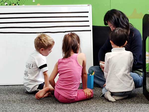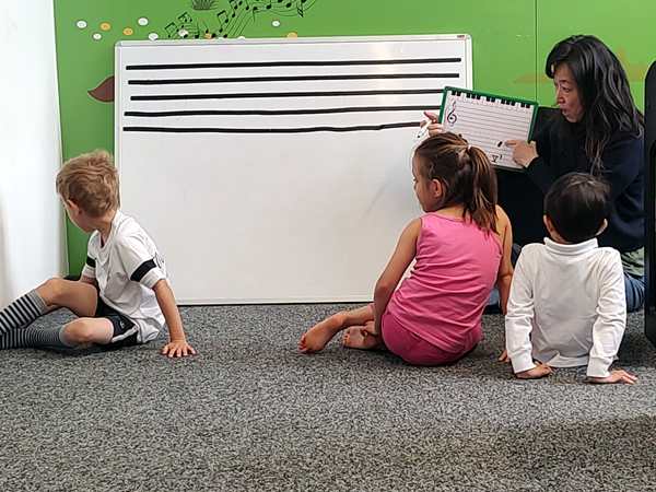 It was time for a new song. And time to play chords for the very first time. We had already worked ahead at home and played it a little. There were just two chords for the left hand in the song, and she taught them the names of the two chords and had them recognize them when she played them. And then it was already story time.