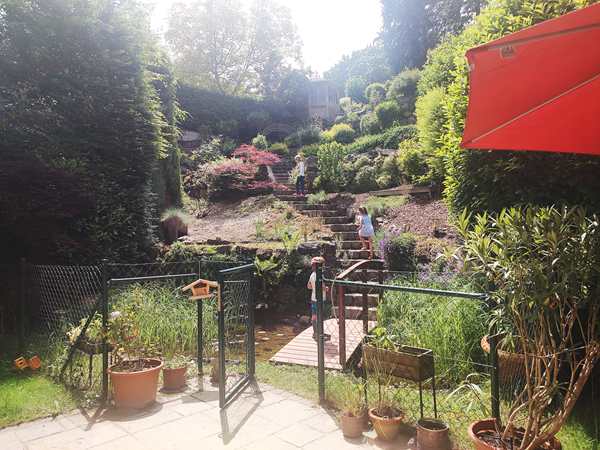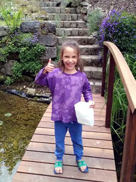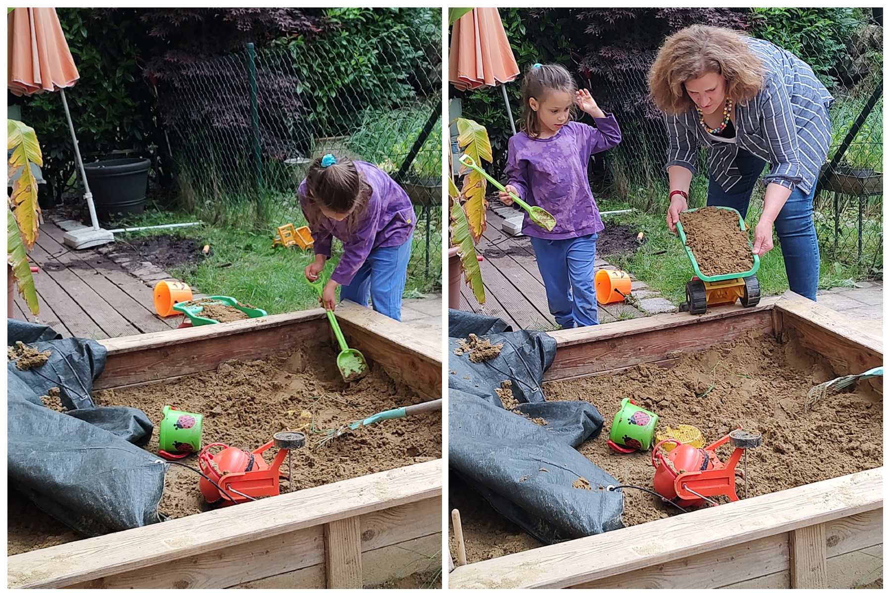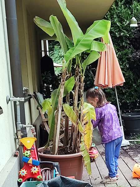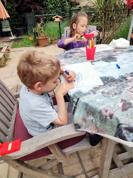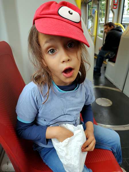 Emmy also went up the staircase with their boy, as well as Tammy, and they played a little at the little pond there. And Tammy watered the plant and played with the sand a little. She also found a few snail houses that she took home with her. Their family's boy likes digging in the ground, and Tammy and Emmy joined in for a while. After that, the boys were covered in soil; Tammy just a little. So they all had to go wash up and change their clothes. Thankfully my friend had some too-small clothes from her son that she could give them to wear home. They did some more playing, and both Tammy and Emmy did some drawing at the table. With 5 pm approaching we decided it was time to get going. And it had just started to sprinkle. We wanted to make it to the tram stop without getting too wet.