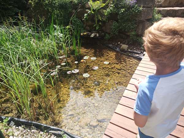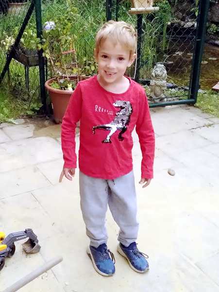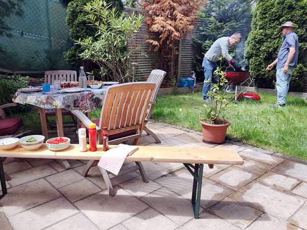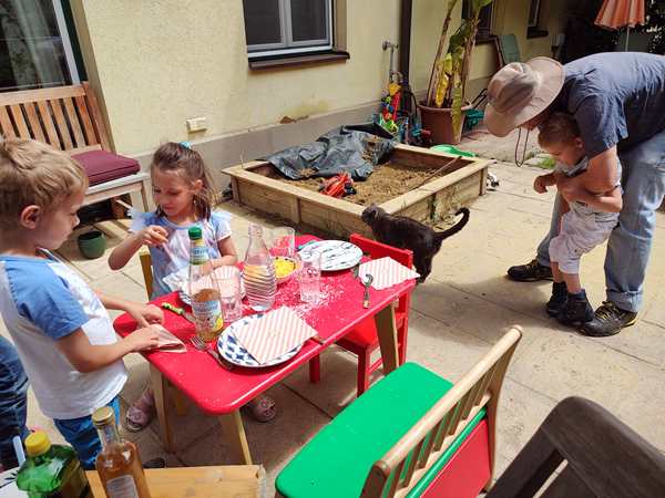 It was a warm and cloudy day, and we sat in the garden where the barbecue was going. It didn't take long before we were able to sit down and start eating. They had prepared lots of great food. Tammy and Emmy had their own little table, while their son wanted to sit with the adults. Sammy sat with Daddy. Emmy never eats much, and he was soon up again to play. He was playing soccer, of course. Tammy ate well, then got up to play. Sammy stayed at the table the longest. He was the most interested in the cat that would come by from time to time, and he got to pet her as well.