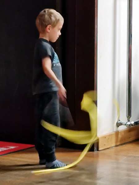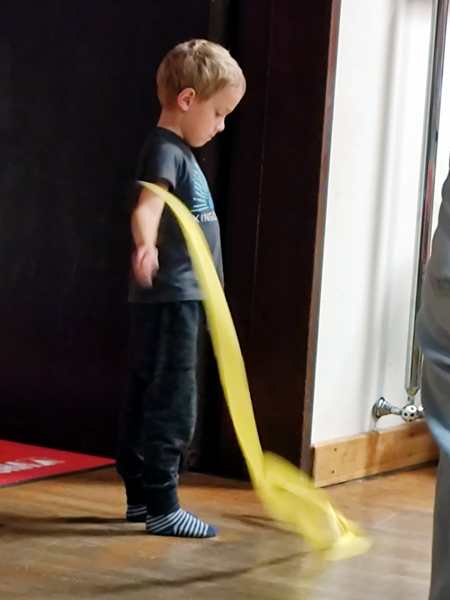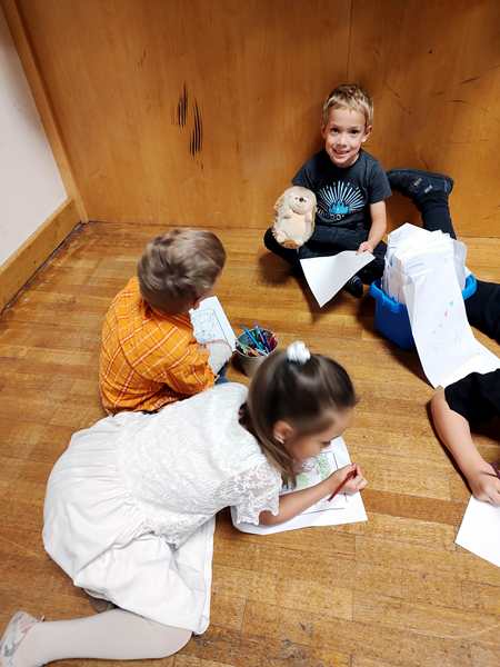 We rode two subways and got to church before the service started. Once someone had brought paper and crayons, all the kids went to the front to draw. Emmy then got some streamers to dance with but he didn't want me to take picture of him with Freddie and the streamers. At 5:30 I took them to kids' church. Sammy was not happy, when I told him that Daddy and I were both staying in the service. He wanted Daddy, and after only 15 minutes someone came to us in the service to let us know Sammy was asking for Daddy to come. Randy spent the rest of the service there. And he texted me early that Sammy wanted to go home. Ten minutes before the service ended I walked back there; they were just finishing up. After they were done, we put our coats on and left.