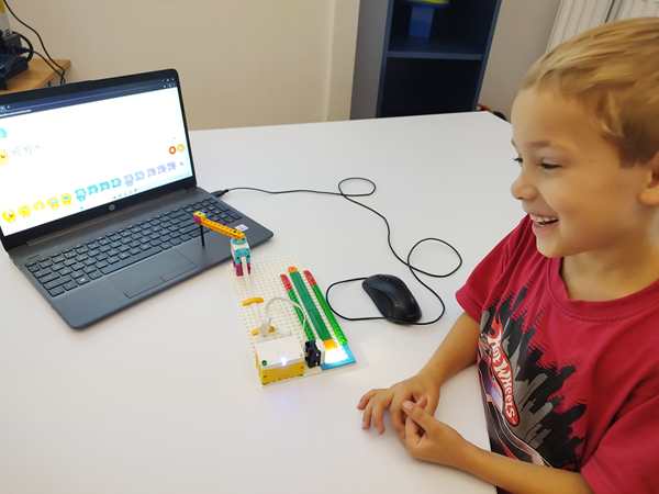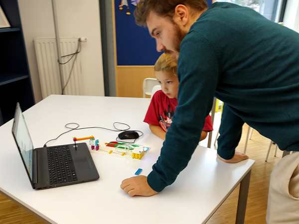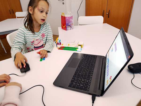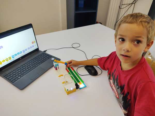 After I was done, I got everything and everyone ready, and at 3:50 pm I left the house with Tammy and Emmy to take them to their programming class that started at 4:30 pm. I dropped them off and walked to the nearby McDonald's to teach at 4:45 pm. After I was done teaching, I returned to their classroom where parents can be present for the last 10 minutes to see what the kids have done. This time they had programmed a little construction they had made themselves. When they hit the button, the arm would move and hit the ball. Then they changed it to when something green is held in front of the light sensor, the arm would move and hit the ball.