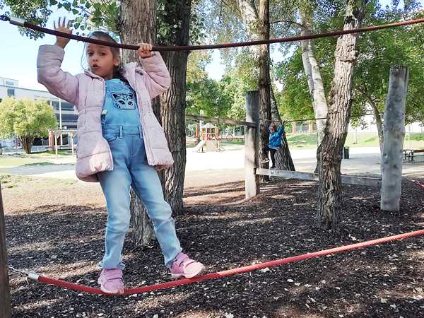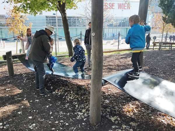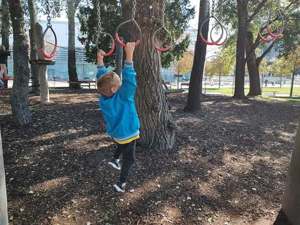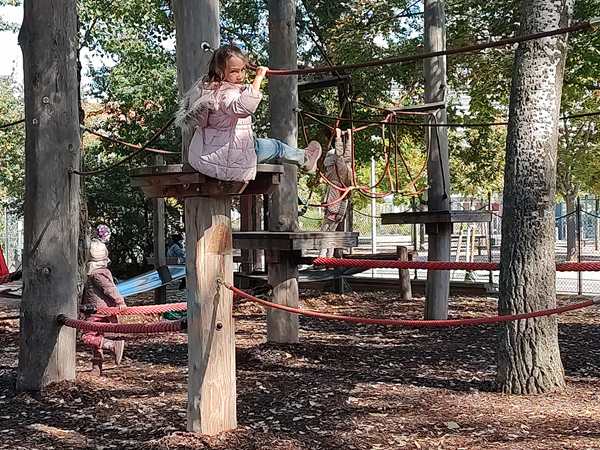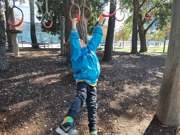 We left the music school and took the subway to the McDonald's that is half-way on the way home. Randy and Sammy met us there, and we had lunch together. We still had time after so we went to the playground that is right there for about half an hour. Emmy wanted to show me how he can hang on rings and go from ring to ring to the end. I was impressed. Tammy wanted me to watch her climb. Sammy was on the long, wide band that moves up and down and had fun there. He was making a friend there, a 7-year-old special needs girl. We got talking to her Mom and found out that she was one of two Moms the girl had. As we were about to leave for a music class for special needs children, I invited her to come with her girl but it was too much for her today. Sammy then still wanted to show me how he can walk over the hanging bridge by himself, holding on to the chains on either side, and he did great.