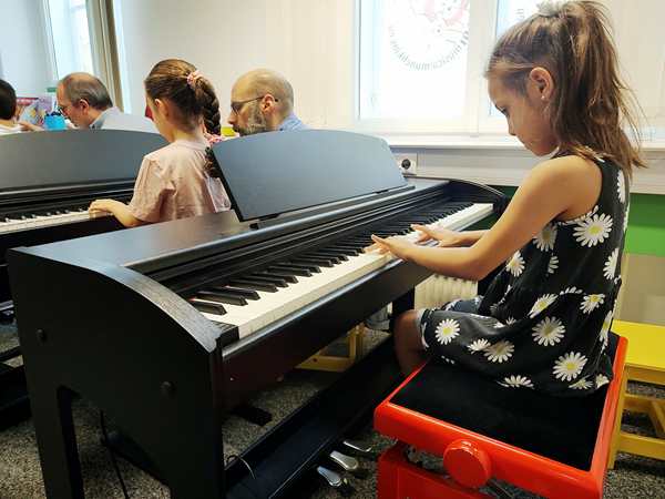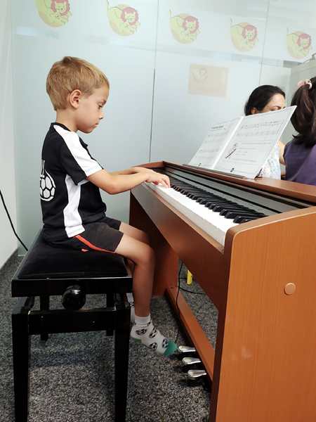 We got to the music school early and waited for 10:30 am to come around. We did greet the founder and the kids' teacher; it was good to be back. Then the class started, and all the students from last semester were there again, plus a gifted girl who used to be part of the Thursday class. So there are 5 students in this class now. After the greeting song, the teacher asked everyone what they had done in summer. Then it was time for the finger warmup. After that, she handed out a paper, and they all had to sing the notes then play the simple scale. Next it was time for the song they'd been practicing all summer. She went through it step by step, then she asked Tammy and Emmy whether they wanted to play it for everyone - together, at the same time. I was surprised when Tammy said yes. I stayed with her to help her, so she did okay, but somehow Emmy failed miserable even though he had done it perfectly at home. It's part of their homework this week, so he'll have another chance next Saturday. And she gave them two more papers each to look at and practice this week. She also told us that they'd be progressing faster this semester and needed to practice more than last year. Puh!