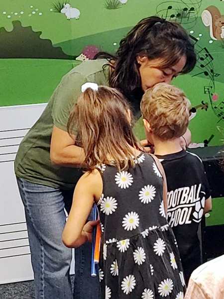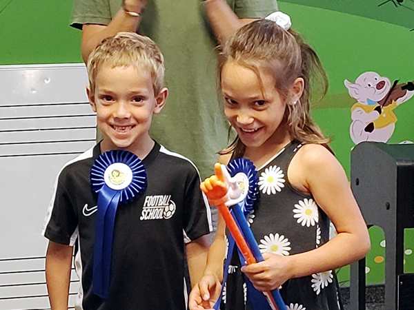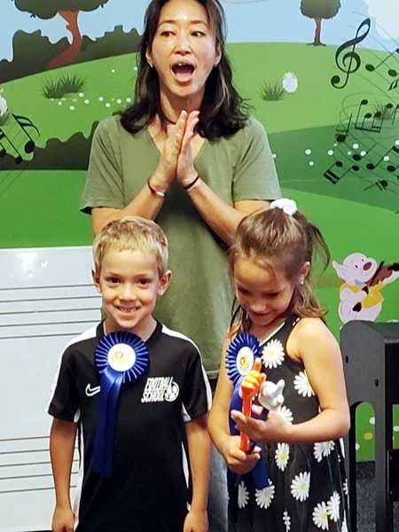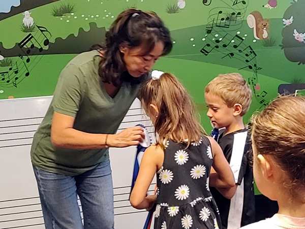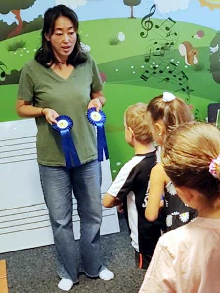 It was time for the sticker for this week, then she grabbed two ribbons and told everyone that Tammy and Emmy were getting those for having practiced so much last semester, and that everyone else could get them as well if they practiced this semester. She put them on the kids, then everyone clapped and the class was over.