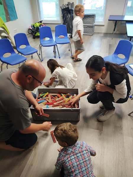 program was going to take place. At some point the guy leading it arrived; he had a younger assistant. They said that only 13 kids were registered for childcare, and just ours were three. I asked them whether they'be be fine with Sammy, and they said yes. We got him out of the wheelchair and put him on the floor, where his siblings were also getting building blocks out. We told Sammy we'd be back, then we left. And Sammy was fine for the next over 90 minutes. The kids had a good time at their program.