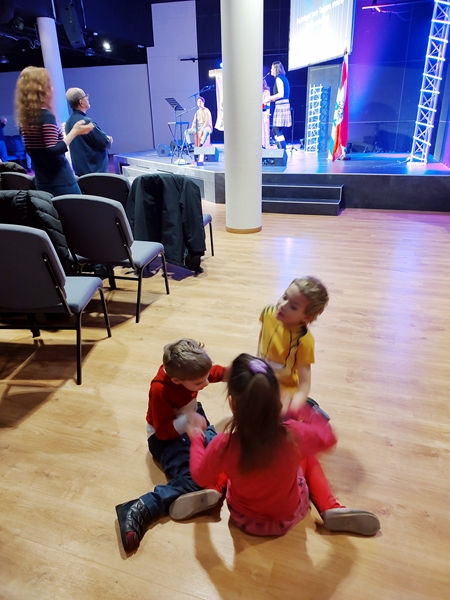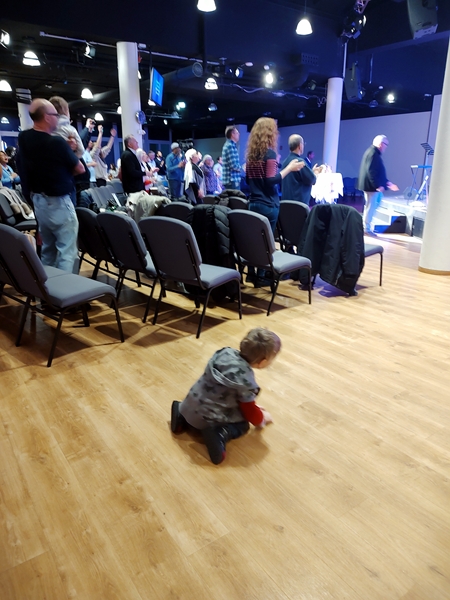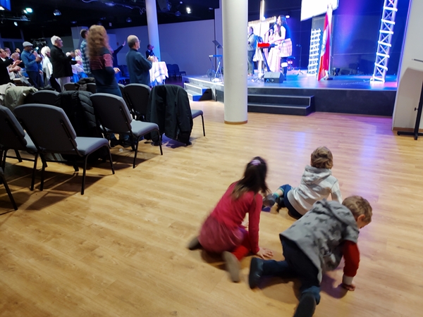 It was after 4:20 pm before we left the house. We had to hurry to make the 4:36 pm train. After the train,we took the subway, then we walked through the mall to get to church. The service had already started. We normally take the earlier train but that one is not running until the end of February. We found good seats to the side and started dancing in worship. The kids were having lots of fun. I enjoyed watching them, and I enjoyed dancing with them. Eventually I sat down on the floor to be on Sammy's level, and Emmy then came and lay down on me. That's when I took the picture - and Tammy snuck into it too.