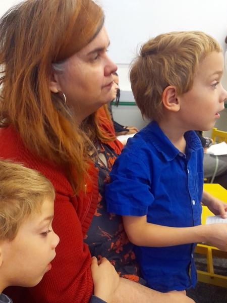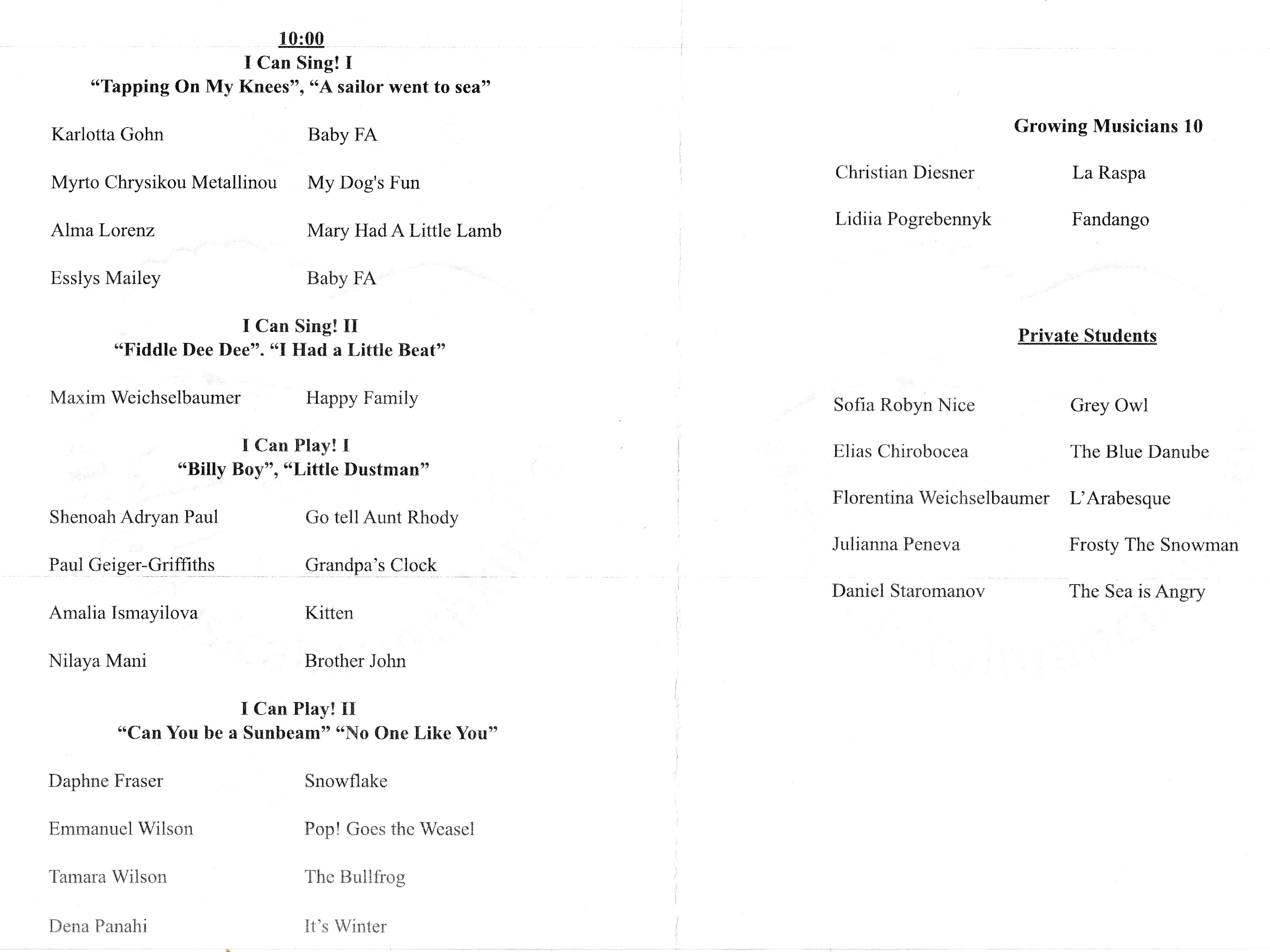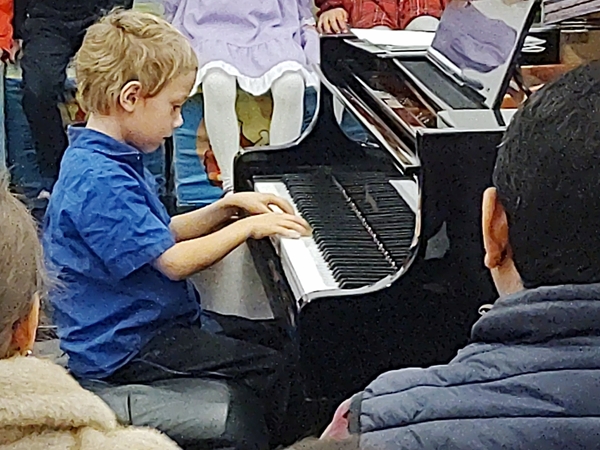 Normally I enjoy getting to sleep in on Sunday morning but this morning I had to get up even earlier than yesterday. My alarm went off at 8:50, then I got up to get ready to leave the house which we all did just before 9:30 am. We took the subway downtown, then walked to their music school where we arrived just before 10 am which was the beginning of the party. It really wasn't a party but the end-of-semester concert for all the students. All the kids were asked to go to the back with one of the teachers. Sammy was looking for his teacher that he loves so much but she was sick and not there. The three of us sat down in the last row of the large room where the concert was going to be. All the parents were waiting for the return of the children and the beginning of the party.