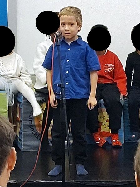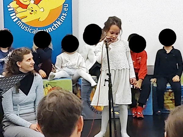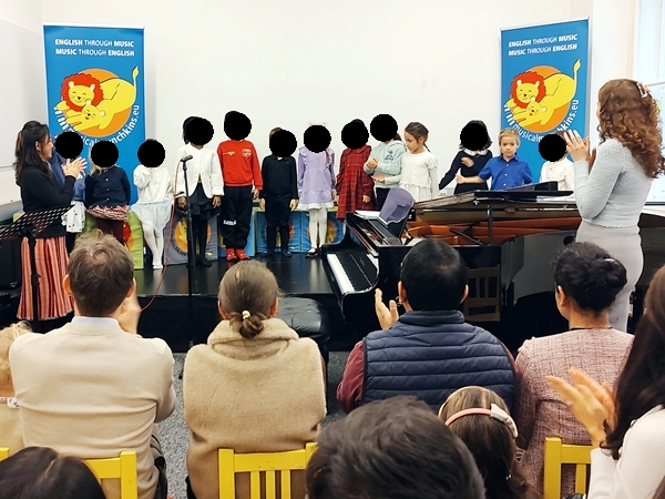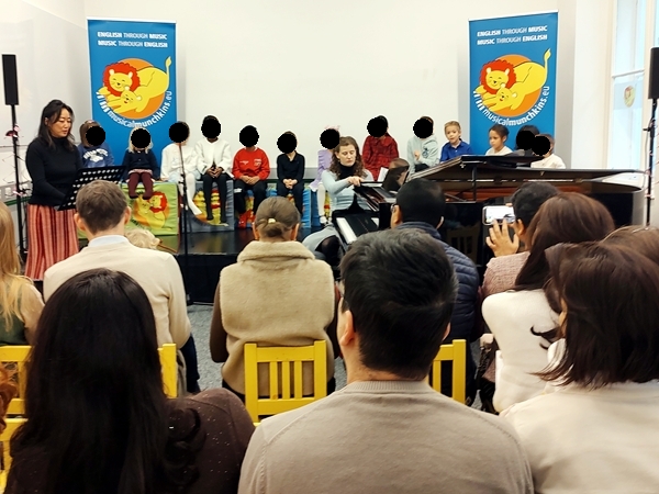 And then they came. They were all holding hands and walking in one after another, straight to the stage where they all sat down. Then the director (their teacher) said a few words. Then it was time for the children to show their skills. It started with the youngest ones doing their songs, then sitting down at the piano one after another and playing one song each. There were a few classes before our kids - all classes that they have completed so they knew the songs and piano pieces. Then it was finally their turn. They are in the last class that sings. Starting next semester, they'll only be playing the piano.
