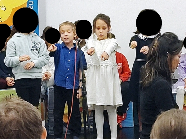 There were the three kids from their class and another girl from the same class from another day. They did the one song first - with their teacher playing the piano - and then the second song. Tammy sings the loudest, Emmy I couldn't even hear at all. They did a good job. In the end they held hands and bowed together, then they sat back down.