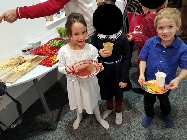 Tammy was next. She said into the mic what she was playing then sat down at the piano. She started well, remembering that it was staccato, but sped up and forgot about the staccatao. In the end she made a big mistake when her fingers weren't on the right keys any more. Later the teacher said to her that she had warned her to play too fast and that that was the result of that. Tammy bowed and went back to her seat. After their classmate had done her piece, those kids were all done. They got up for a picture, then were released to go sit down with their parents. Tammy and Emmy gave us big hugs, then Tammy went back to the front to watch while Emmy stayed with us. There were still the older and private students that had to play. It didn't take that long, and so it was only 11 am when everyone was done. The buffet was open. Emmy made a quick dash to the chips.