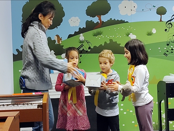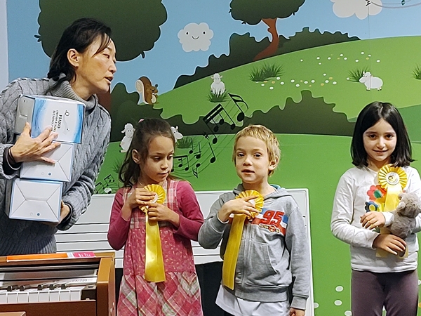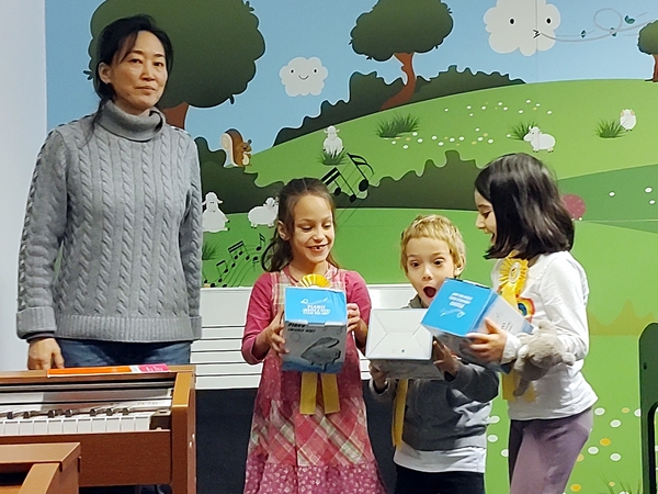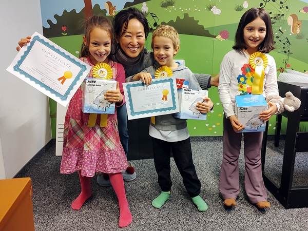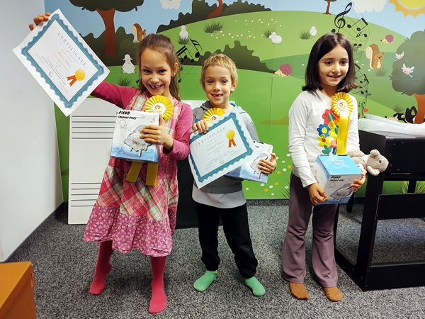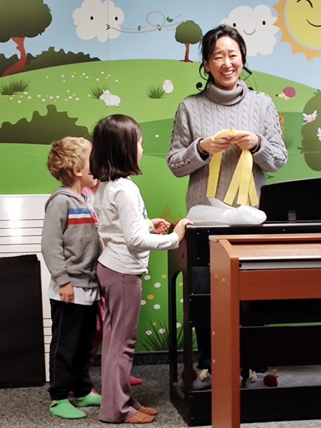 She had them come to the front and gave them a ribbon each - it was for all they had accomplished this semester, including their concert last Sunday. Then she got the special prize out that they had all been looking forward to this semester: a glass piano music box. To get that, we had to first count whether they had practiced a 100 days this semester. So I started counting. Tammy had practiced 115 days, and Emmy 116 days. Tammy was especially excited and jumping around shouting out her number. The teacher then came with the three pianos and handed them to each of the students one at the time. All three were very excited about this special gift. The pictures speak volume. Before leaving, they still wanted to get their last stamps and the final sticker in their sticker book. Then they got a cookie each, and the semester was over.