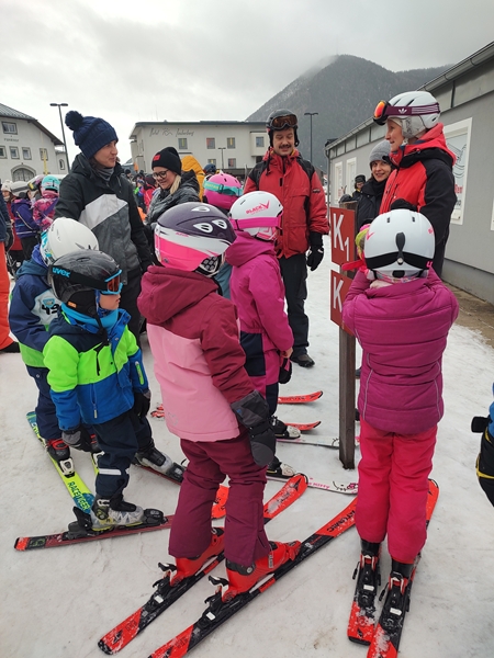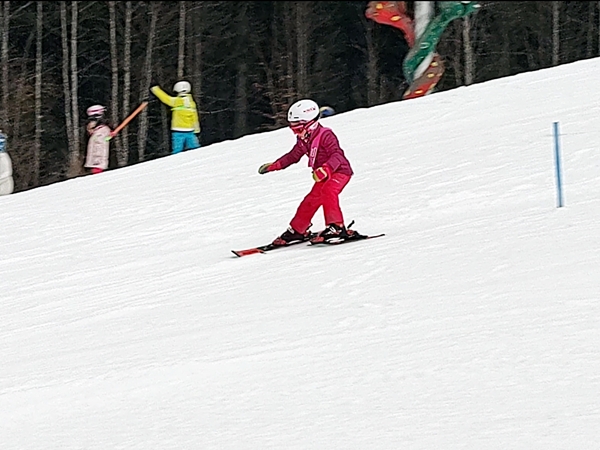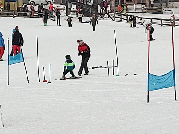 We walked to the bottom of the slope where all the ski school groups meet. The kids had a different teacher today as the other one was not there today, and it was a woman. She then had them walk up the hill with their skis in hand to get to the start of the ski race that they were going to start their day with. Randy, Sammy and I stayed on the bottom at first, then walked up the hill to get closer and have an easier time watching the kids run their race. I walked up even more than Randy and Sammy.