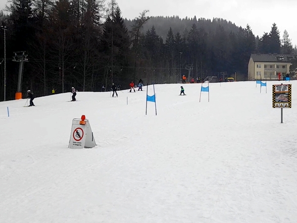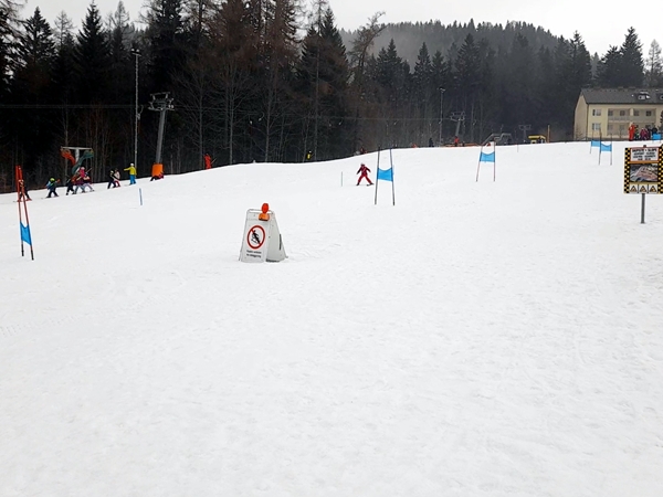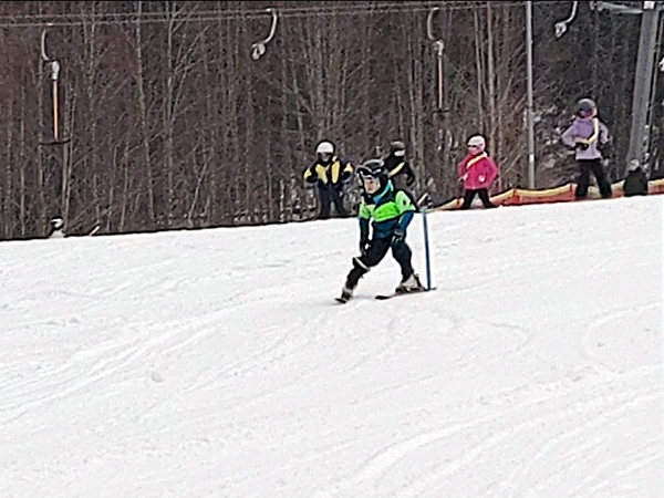 It took a while but then it was their turn. The race was really not organized very well. There were no numbers, no loudspeakers or announcements so you had to really watch and recognize your child to be able to know when they'd come down the hill. They had two races set up next to each other, and our kids had to go down the race with just little sticks sticking out of the ground to go around. Tammy was the first one in their group to come down, and she seemed faster than the others. Emmy was last and seemed to be a little slower. He'd been telling everyone that he had won a race before and wanted to win again. But then last night, when he was having one of his fits, he'd said that he'd be last today.