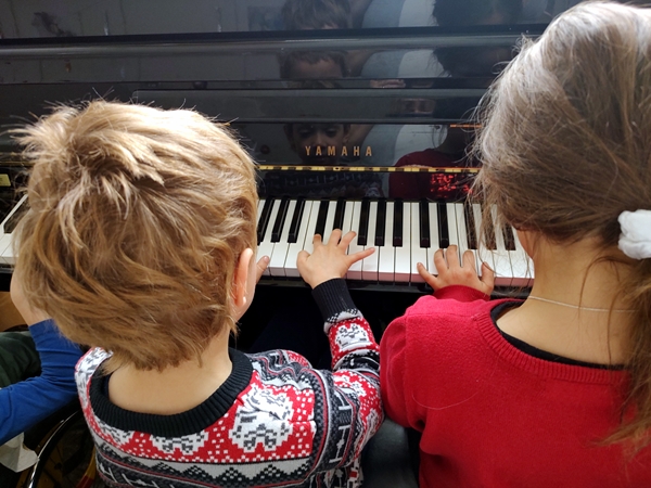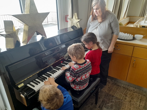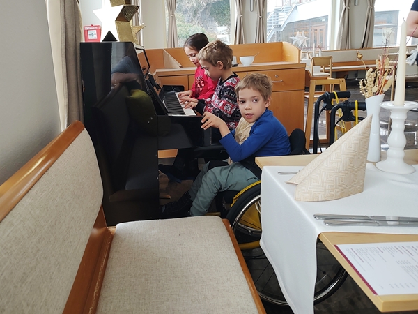 After my alarm had woken me up, I got dressed and went downstairs to take the 11:30 am shuttle to pick up Tammy and Emmy at 11:45. Our return shuttle was right after so I was really hoping we'd make it back in time, and we did. By noon we were back at the hotel. The kids took their ski clothes off and relaxed for a few minutes, then we went to the restaurant to eat. Today we ordered three different soups that we all shared, and they also gave us some bread and butter each that we all enjoyed. The kids had already noticed the piano near us and Tammy wanted to play it. I told her to ask the waiter whether it was okay to play but she was too shy. Emmy then went to him and asked, and he said yes. All three kids then sat down by it to play. Emmy started with the finger warmup, then they did their homework piano pieces and what they're going to play at the competition in 10 days. Once they were done, the only other family in the dining room clapped for them. It was another kid and his family who was in the same ski school group as them.