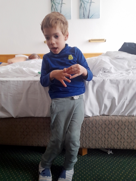 We paid and left. Emmy wanted to play fusbal with me, so we all went to the room there to play. Tammy didn't want to play, though. It was Emmy and I who had lots of fun playing. Then we returned to our room where we still had a little time to relax before having to leave. Sammy sometimes watches his tablet while standing by the bed and leaning against it, and Randy took his picture where he stands by himself, only leaning against the bed. Good job, Sammy!