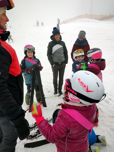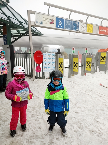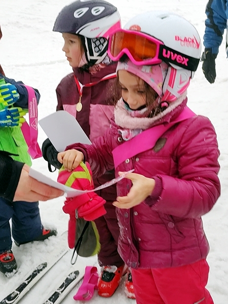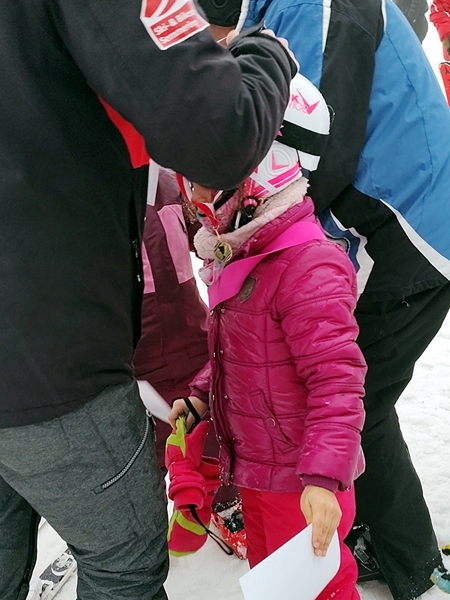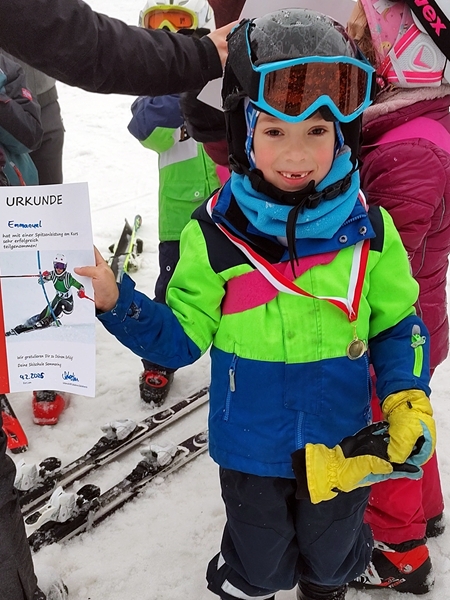 When I got to where you get on the gondola, the kids weren't there yet. Instead I saw parents from one of the boys from their group I had talked to before and started chatting with them. And then we could make them out in the thick fog. They were coming down the hill. The kids told us that they had gone up and come down twice, down the blue slope, the easiest one. Now they were ready for the award ceremony, especially Tammy who couldn't wait to stand on the box that said "first place". However, there was no ceremony. The teacher simply handed out the certificates and the medals to everyone, that was it. Tammy was looking for "first place" on her certificate but it wasn't even on there. She was very disappointed about it all.