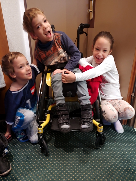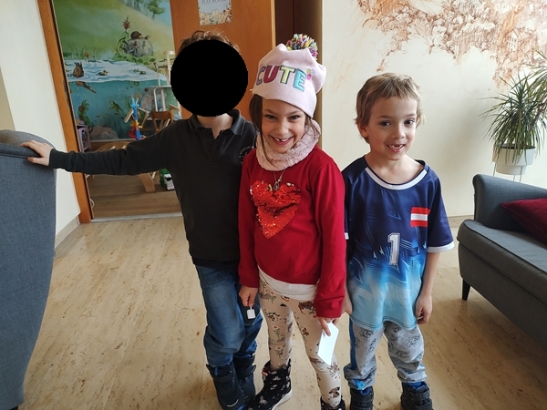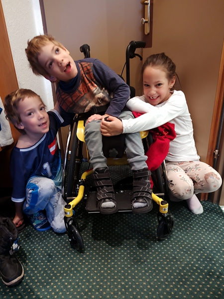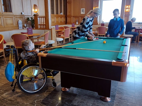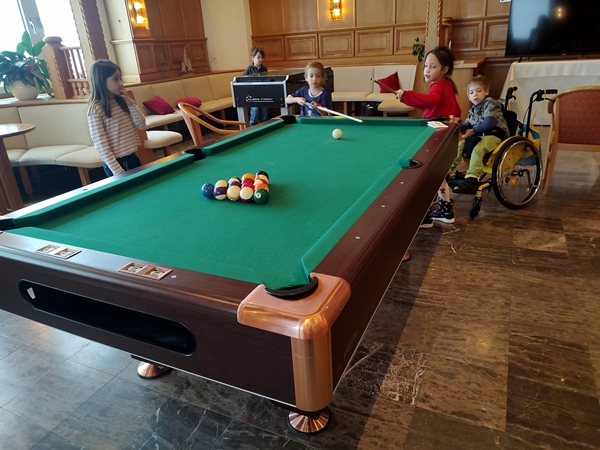 We finished packing and went downstairs with all our luggage. The boy and his Moms were also packing and about to leave to go back home. We met again in the lobby and Tammy went to the dining room with him to play the piano for him. Then we all went to the room with the fusbal and pool table. Emmy wanted to play with me one last time. The kids also played pool for a short time - or tried to. Then they went to the toddler room and played there. They were having lots of fun. I sat in the lobby as we were waiting for our shuttle, and the boys' Moms were sitting near me so we were talking. We then took a picture of the three kids.