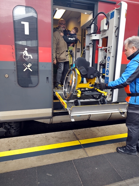 At 11:37 am we arrived at the main train station in Vienna. They used the elevator again to get Sammy off the train but this time Randy took him out of the chair for some reason. After we had all our stuff, I looked at my phone when and what platform our train home was gonna leave from. Its departure was only a few minutes away so we took the elevator down and then back up at the right platform. The train was way on the other end of the platform so we started sprinting again and just about made the train before it left.