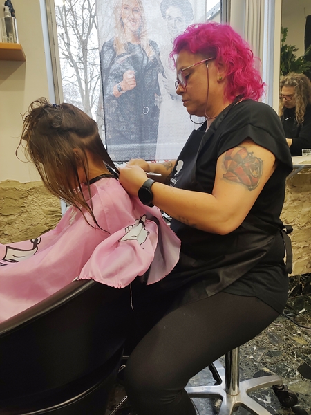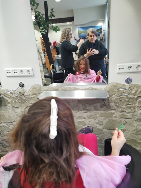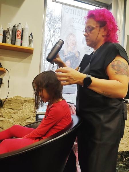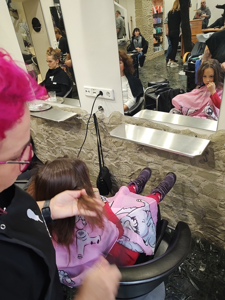 We walked to the nearest hairdresser where the boys had had their hair cut before. Tammy had three huge knots in their hair that I was not able to undo. It was time to go see the professionals. The place was full but they took us. A lady with pink hair had Tammy sit down on the chair after she had put a big cushion on it and started working on her hair. She was shocked by the knots and tried to open them but was despairing. Another hairdresser then came and gave her tips but he had leave again. Then the boss hairdresser came and helped for a while. Then the pink-haired lady had to go and take care of another customer and Tammy had to sit there and wait for her to return. Emmy and I were sitting on the small step by the window where he did his reading practice with me. We were all getting impatient as we had already been there a while and Tammy was far from being done. Finally the lady returned and continued working on Tammy. In the end, all the knots were out, and she cut a few centimeters off which had been much needed. Then she wet her hair and dried it. Tammy looked very pretty even though her hair was longer than I had envisaged.