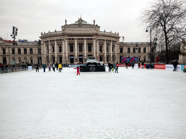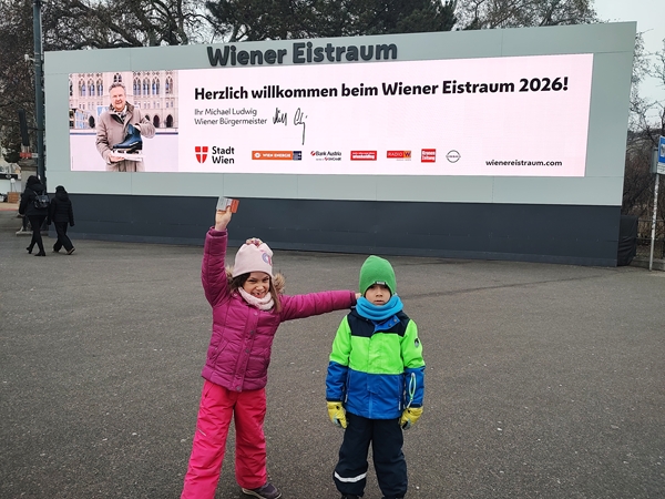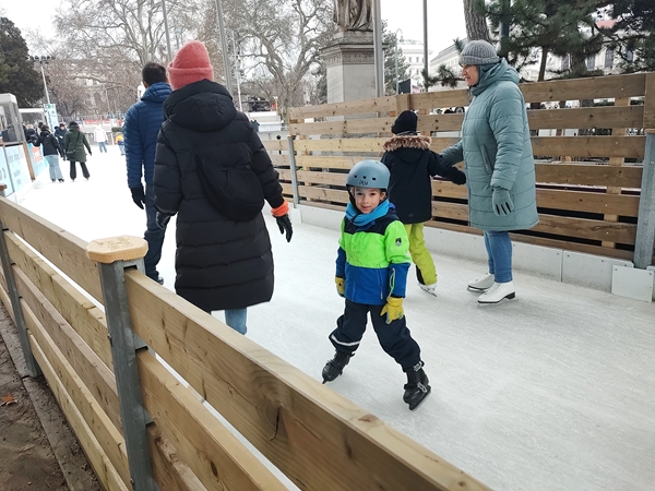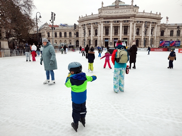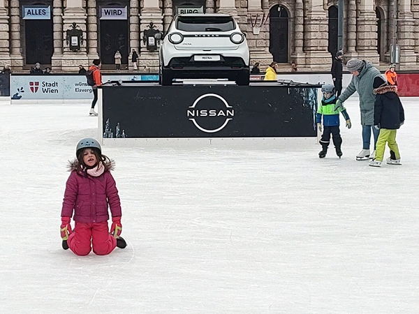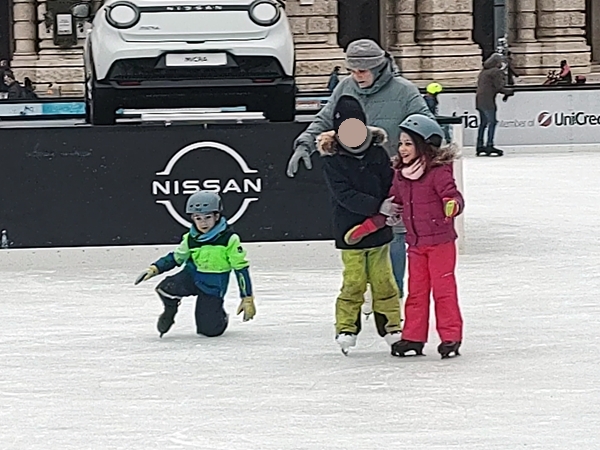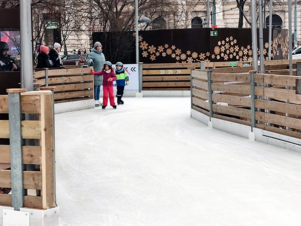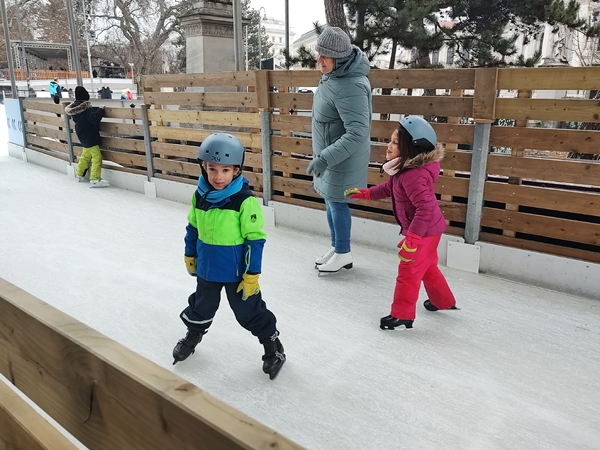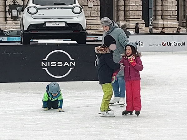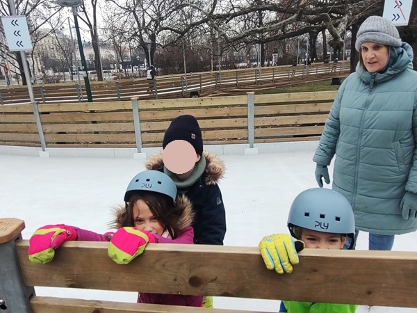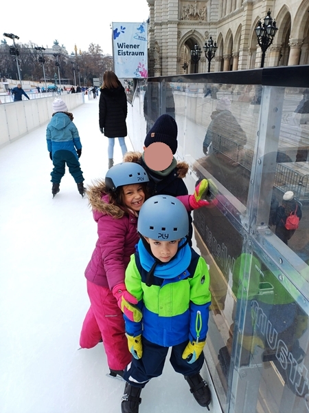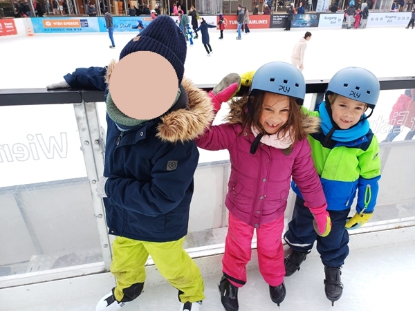 Until my friend called me to find out where I was. I got up and started walking in the direction she told me and saw them standing on the top level looking down at me. They were having lots of fun. They then came back down and went to the big surface right by the entrance where they did a few more rounds. My friend was helping Emmy, while the other two kids were skating together at times. Then Randy and Sammy arrived, and soon they were all done and came off the ice as they were getting hungry. We talked about where to eat - right there they had Austrian food, and then there was McDonald's not far away. The kids all voted for McDonald's even though the adults would have preferred the Austrian food. Oh well.