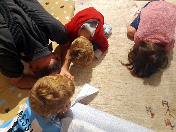At 3 pm I had a student which is unusual as I don't usually have students on Sunday but there was no other way. After I was done at 4 pm, I went downstairs where we did our little family service. I first did a teaching on worship, on kneeling, then a teaching on praying in tongues. And we applied right away what I had taught them, worshipping God while kneeling, then praying in tongues. We had a precious time together. And I gave the kids a paper with the two Bible verses, now that they can already read a lot of the letters of the alphabet. I told them I'd ask them to tell me the first verse before going to bed tonight.
