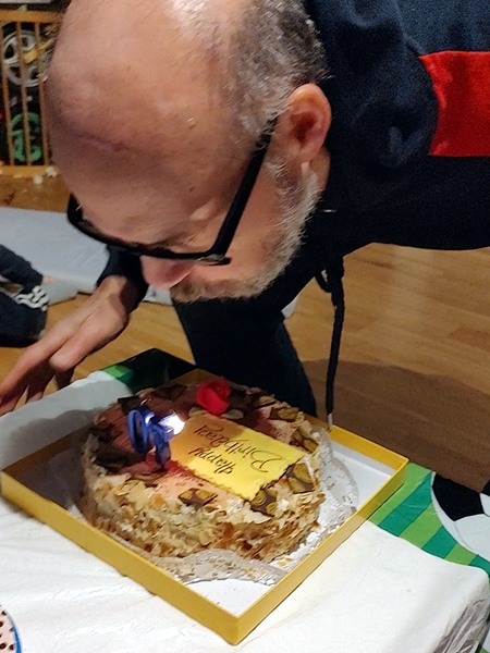 After we had eaten, Randy left at 1 pm to pick up Tammy and Emmy while I picked up Sammy just after 1:30 pm. We got home just before 2 pm, and just minutes later Grandma arrived. I was just getting two candles to make the number 70 out. Grandma had brought a birthday cake from one of the best pastry shops in town. It looked great. I put the numbers on, got plates and forks and matches, and three of us went downstairs to wait for Randy's return. The cake was ready for him. I just had to light the candles.