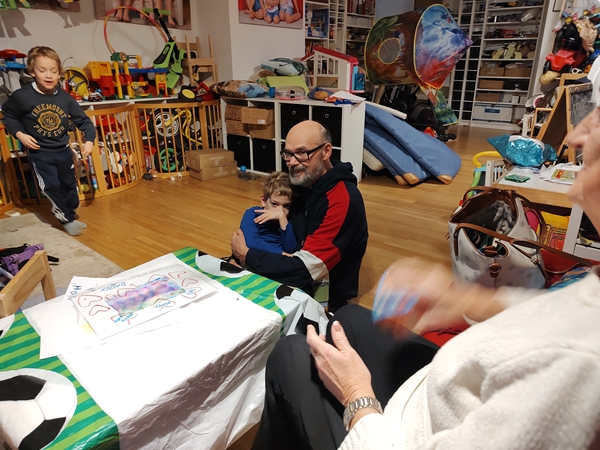 The three of us were sitting next to each other on the couch. Then Sammy was standing next to Grandma, not next to me, when he lost his balance, and his hand fell on the beautiful cake. We were startled as it was potentionally disastrous but nothing had happened. There was just a little identation. Still, after a shock moment Sammy started crying hard. I tried to comfort him, telling him it was okay, that nothing had happened, that the cake was fine, but he would not stop crying.