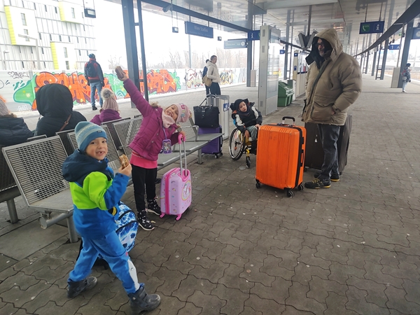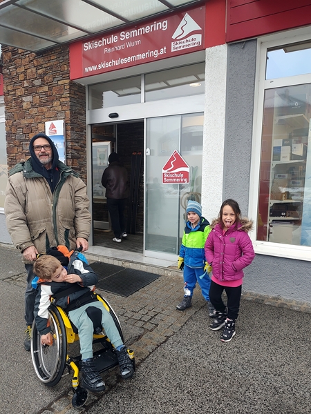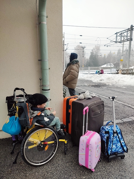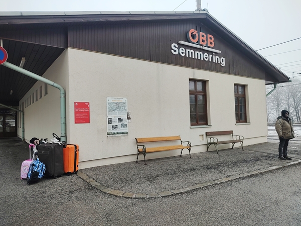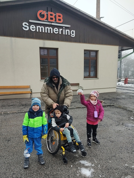 At 1:39 pm the train arrived at our destination, in Semmering on the Semmering (mountain). The lady said we needed to get the wheelchair out separately, without Sammy in it. She helped us with everything and gave the kids' toy train tickets. Then the train left. We were at the end of the platform and had to go all the way to the other end to get to the exit. There were not many people there but a few others were waiting to be picked up. There was no shuttle from the hotel waiting for us even though they had said they'd be there.