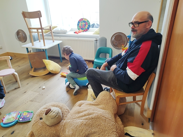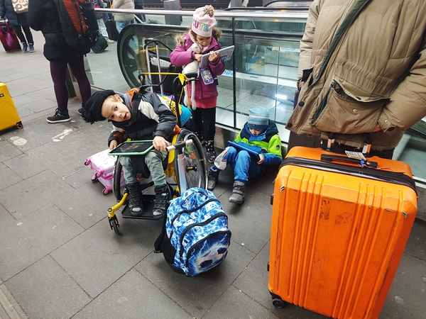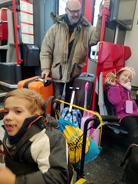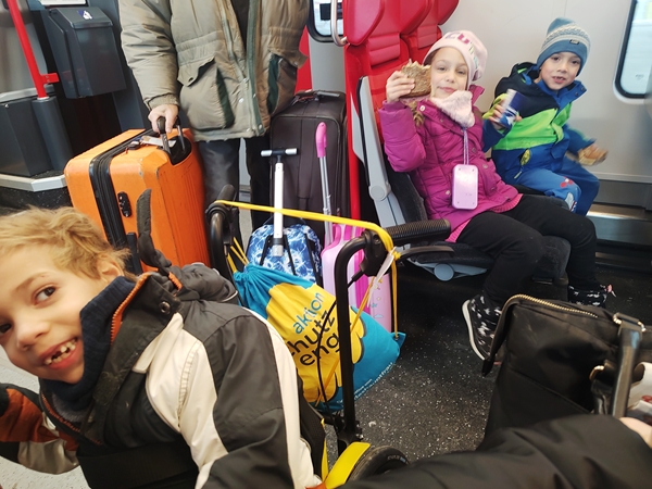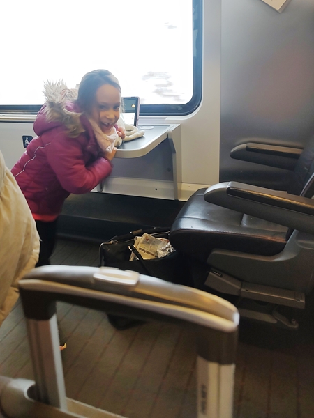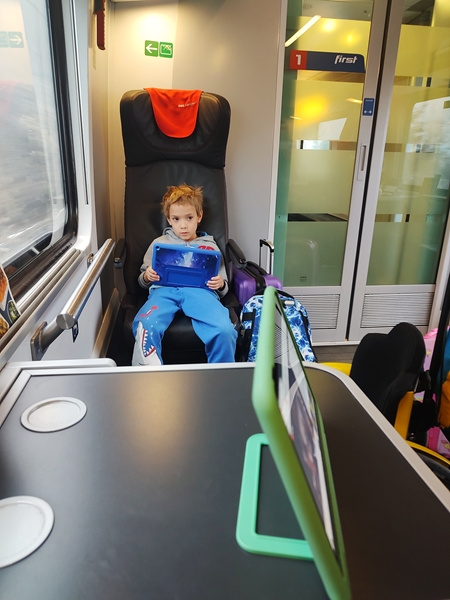 We walked to the train station and took the 11:20 am train - a new one, thank God. When we got off at the main train station, I already knew what platform we needed to head to, thanks to my app. We took the elevator down, then the elevator up to the right platform. When we got off, there were lots of people everywhere. It was still quite early; we had another hour until our train would depart and so there were three more trains leaving from our platform before. And so the kids started using their tablets while waiting. After a while we were getting pretty cold as we were outside, and Sammy was getting pretty impatient again.