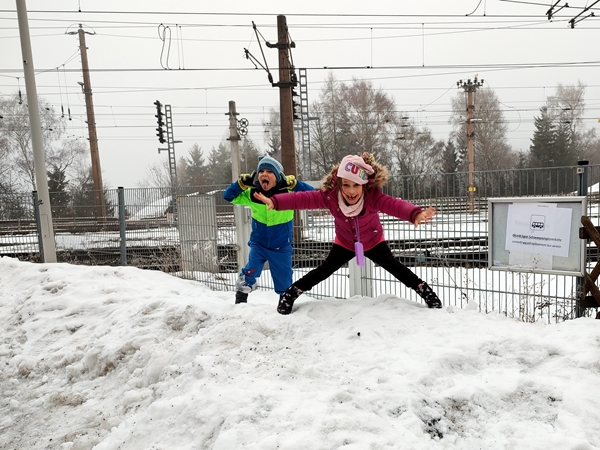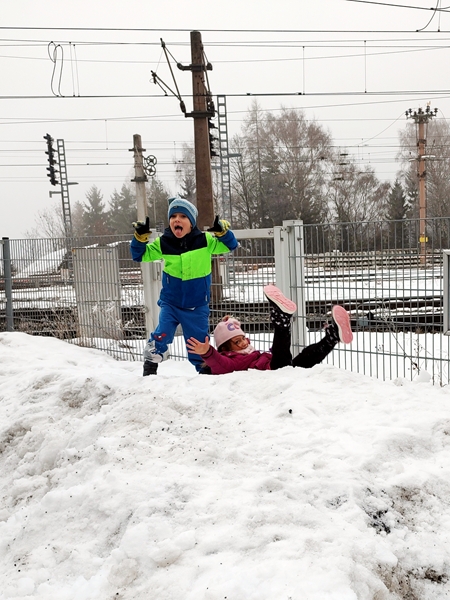There were already quite a few people in the small place, and by the time we left the line went out the door. The first ski boots they tried on fit, and so they adjusted their skis for them. Then they got helmets. It took quite a while for Emmy as all the helmets were too big for his little head. But then we were finally done. We had brought a bag to put all the stuff in that I ended up carrying. Then we walked back to the bus stop where the shuttle was gonna pick us up again. I was surprised when it was more than 20 minutes that we had to wait for it once we ordered it. Tammy and Emmy were having fun playing with the snow but Sammy was getting quite impatient.