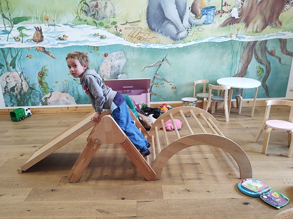 We got our stuff out and went into the hotel lobby and to the reception desk. I had to fill out a form, then the lady told me that our rooms weren't ready yet. It was 2:30 pm, and check-in was at 3 pm. The lady gave me zero information on anything so that I had to ask her all my questions to find out what I wanted to know. Then I sat down in the lobby to wait for our rooms to be ready. The kids had already discovered the toddler room right there and were inside playing and having fun. They had already made friends with another girl their age who was also waiting for their room to be ready.