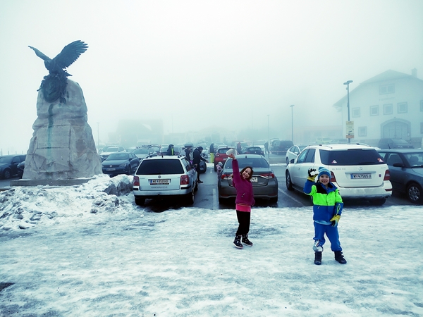 We waited a little longer, then the shuttle finally arrived. It was a van, and we started loading everything into it. It had six seats in the back, three on each side facing each other. The kids sat next to each other facing us, with us sitting the same direction the driver us. The kids were enjoying the ride. It went uphill all the time from the train station, and there was fog everywhere. You couldn't see anything at all. It didn't take long until we pulled up in front of the hotel.