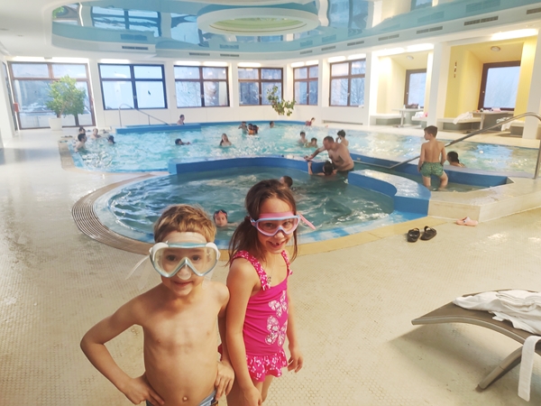 This time it was a car that arrived at 4:30 to take us back to the hotel, and it was tight to get the wheelchair into the trunk but it worked out. Back at the hotel we put their equipment into the ski room, then picked up two bathrobes and returned to our rooms. The kids were impatient to go swimming, so we all put our swimsuits on right away and walked to the pool that was on our floor. There were lots of people in it. And I was surprised how cold the water was. The kids were having lots of fun, me not so much as I would have preferred warmer water. We then ended up not staying very long because of it. We did enjoy the hot showers right there to warm us up again but the air was pretty cold, especially once leaving the pool area.