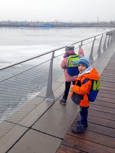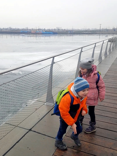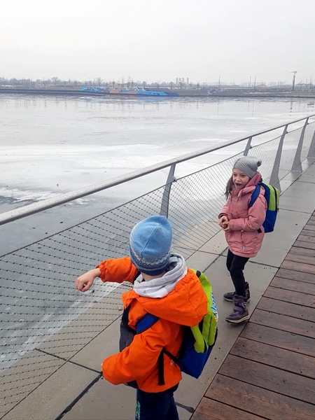 At 1:30 pm Randy returned and went straight downstairs to get everything ready downstairs as the heating repair people are coming in the morning. For years we've had trouble with the heating, and right now we only have 17 degrees Celsius downstairs. He not only cleared the area of the heating but also vaccuumed it. It took him the whole half hour he was home. At 2 pm he left again to go pick up Tammy and Emmy. On the way back to the subway they threw some stones onto the frozen lake and had fun doing so.