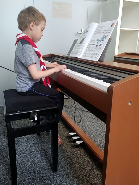 The teacher started with the greeting song, then she asked the kids what they had done during their Easter break. After that, it was time to start with the finger warm-up. Next, she had them sing and play a few old songs, and they each got to choose one song to play for everyone else. Then she quickly moved on to a new song and had them mark the chords and the skips. They then just played the chords in the left hand. Finally, it was time to sing the new song up front before story time. This time the teacher told the story, and the kids helped. For once it was a new story. After that the only thing left to do was to get their stickers and stamps. Since they had missed the last class before Easter break, they now had 4 weeks of stamps they got, one for every day that they practiced.