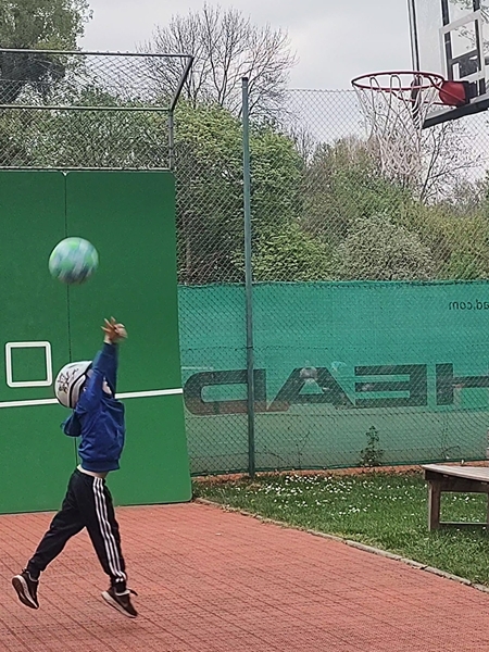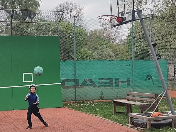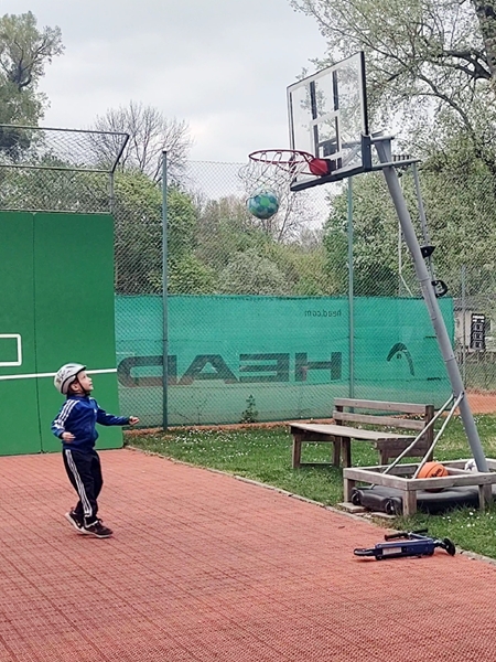 The kids joined me, the tennis club president briefly talked to me about paying the club fees (gulp!), then we made our way to the exit. On the way there Emmy saw the basket ball hoop and wanted to play. He wanted me to film him, and he actually got it in while I was filming. Then we left for good.
