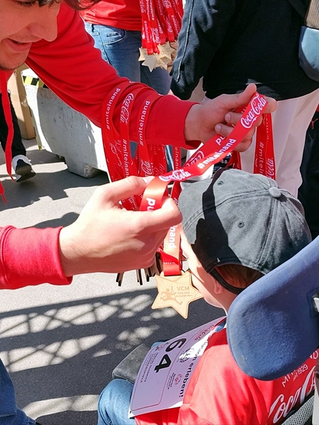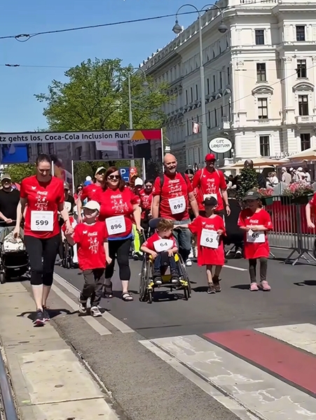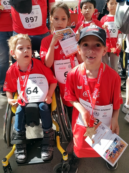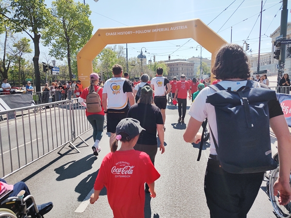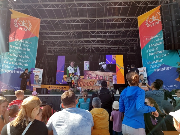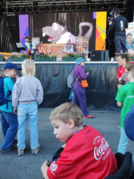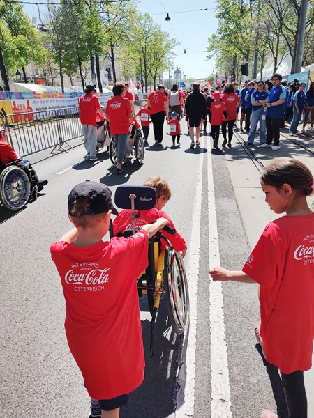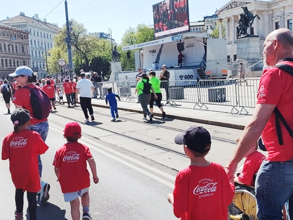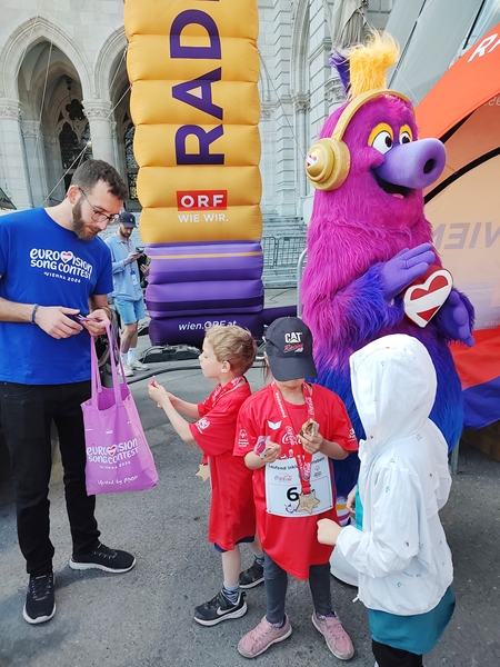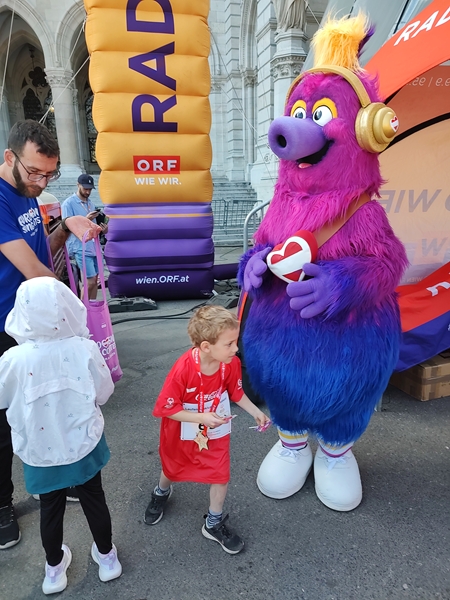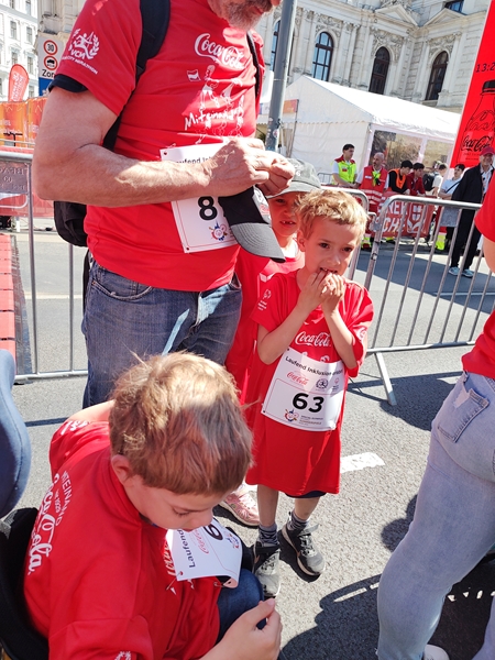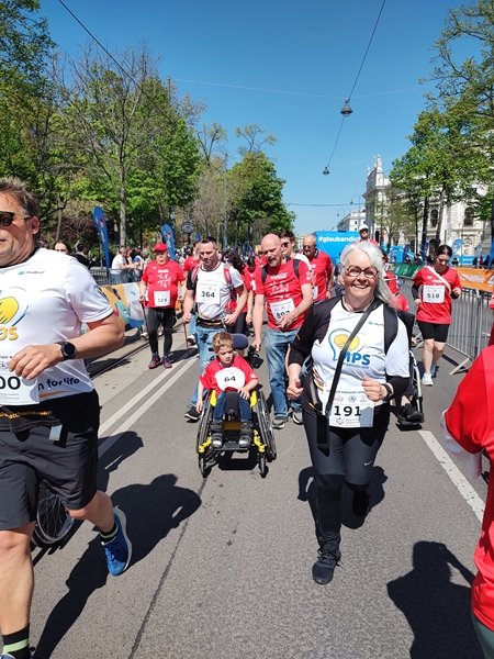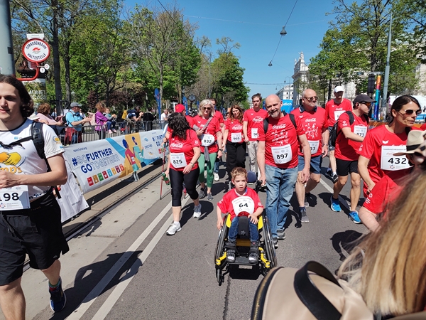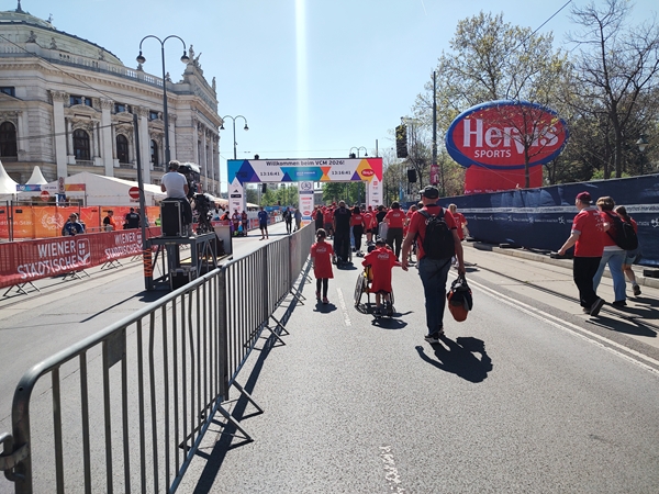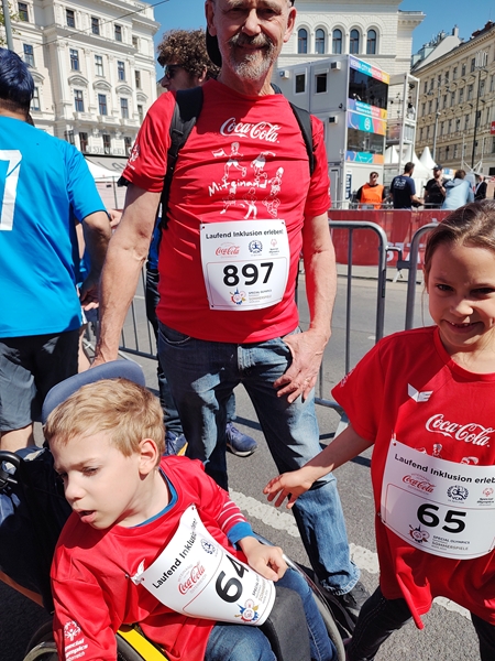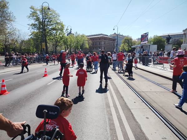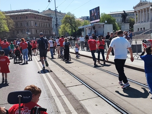 Just after 1 pm the line finally started moving. They let us in to go all the way to the starting line. There we could hear the MC who was interviewing a few people including the mayor of Vienna. At exactly 1:30 pm the race started - the inclusion run with 1000 people with handicaps and their relatives and friends. It's the weekend of the Vienna City Marathan that 49.000 people registered for to run tomorrow. However, there was no time-taking for the people in the inclusion run. Some could run, some could only walk. Everyone went at their speed possible to them. We pushed Sammy, while Tammy and Emmy sometimes ran ahead a little. We walked to the parlament then turned around and walked back on the other side and then through the goal. The mayor was standing at the goal and smiling at everyone, as well as some other famous people. One of those guys, a sports guy from TV (Philipp), came up to Sammy and gave him a hi-five. It was really sweet. We kept walking, following the crowd, until we got to the entrance of "the village" that was set up on Town Hall square. There some guys were distributing the medals to all the participants. It was wooden and not very good-looking.